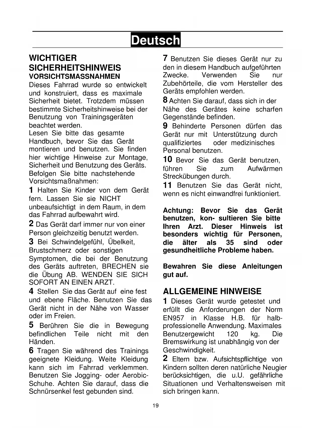 Benutzen Sie das Gerät nicht, wenn es nicht einwandfrei funktioniert. Achtung: Bevor Sie das Gerät benutzen, kon- sultieren Sie bitte Ihren Arzt. Dieser Hinweis ist besonders wichtig für Personen, die älter als 35 sind oder gesundheitliche Probleme haben. Bewahren Sie diese Anleitungen gut auf. ALLGEMEINE HINWEISE