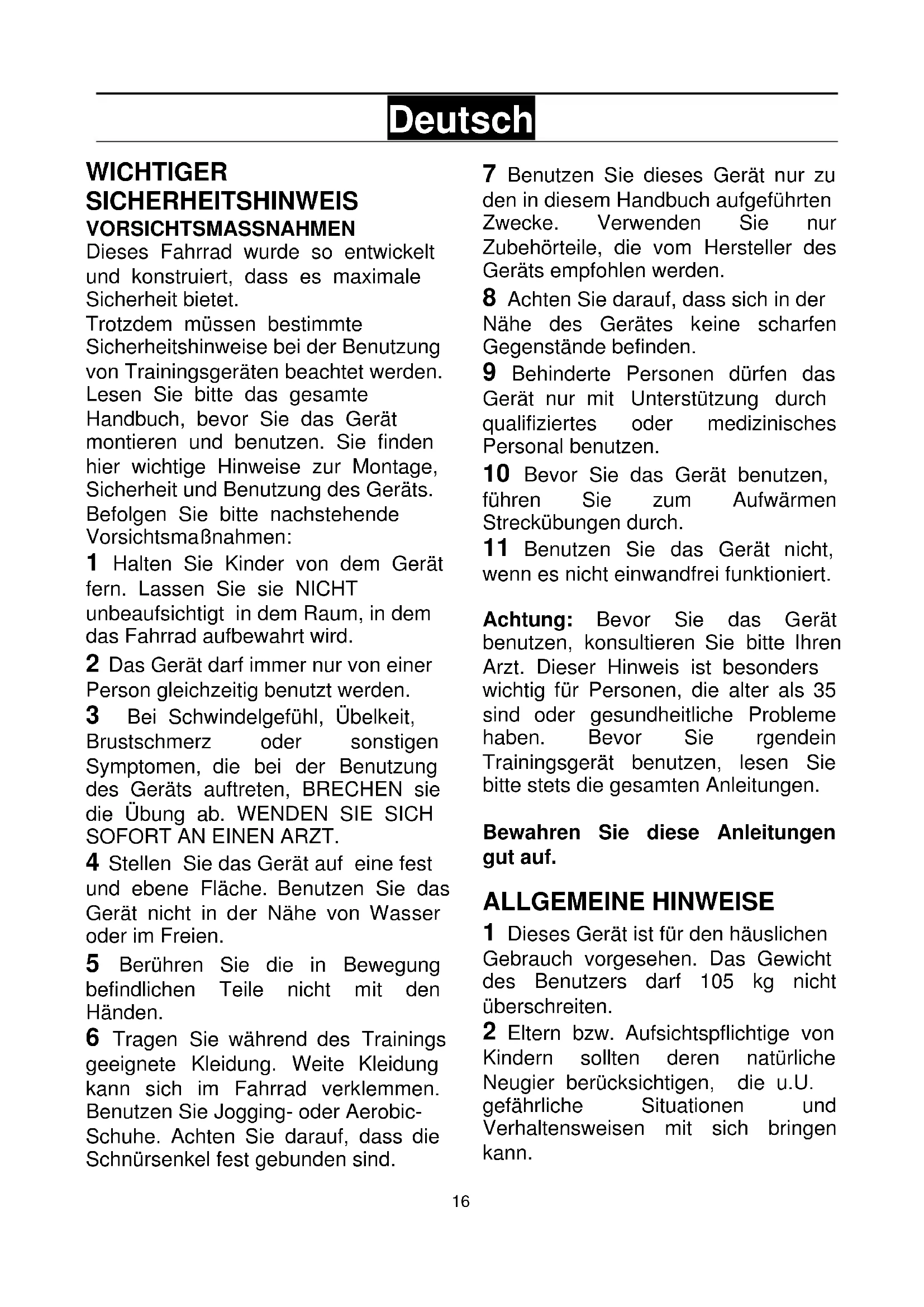 Benutzen Sie das Gerät nicht, wenn es nicht einwandfrei funktioniert. Achtung: Bevor Sie das Gerät benutzen, konsultieren Sie bitte Ihren Arzt. Dieser Hinweis ist besonders wichtig für Personen, die alter als 35 sind oder gesundheitliche Probleme haben. Bevor Sie rgendein Trainingsgerät benutzen, lesen Sie bitte stets die gesamten Anleitungen. Bewahren Sie diese Anleitungen gut auf. ALLGEMEINE HINWEISE