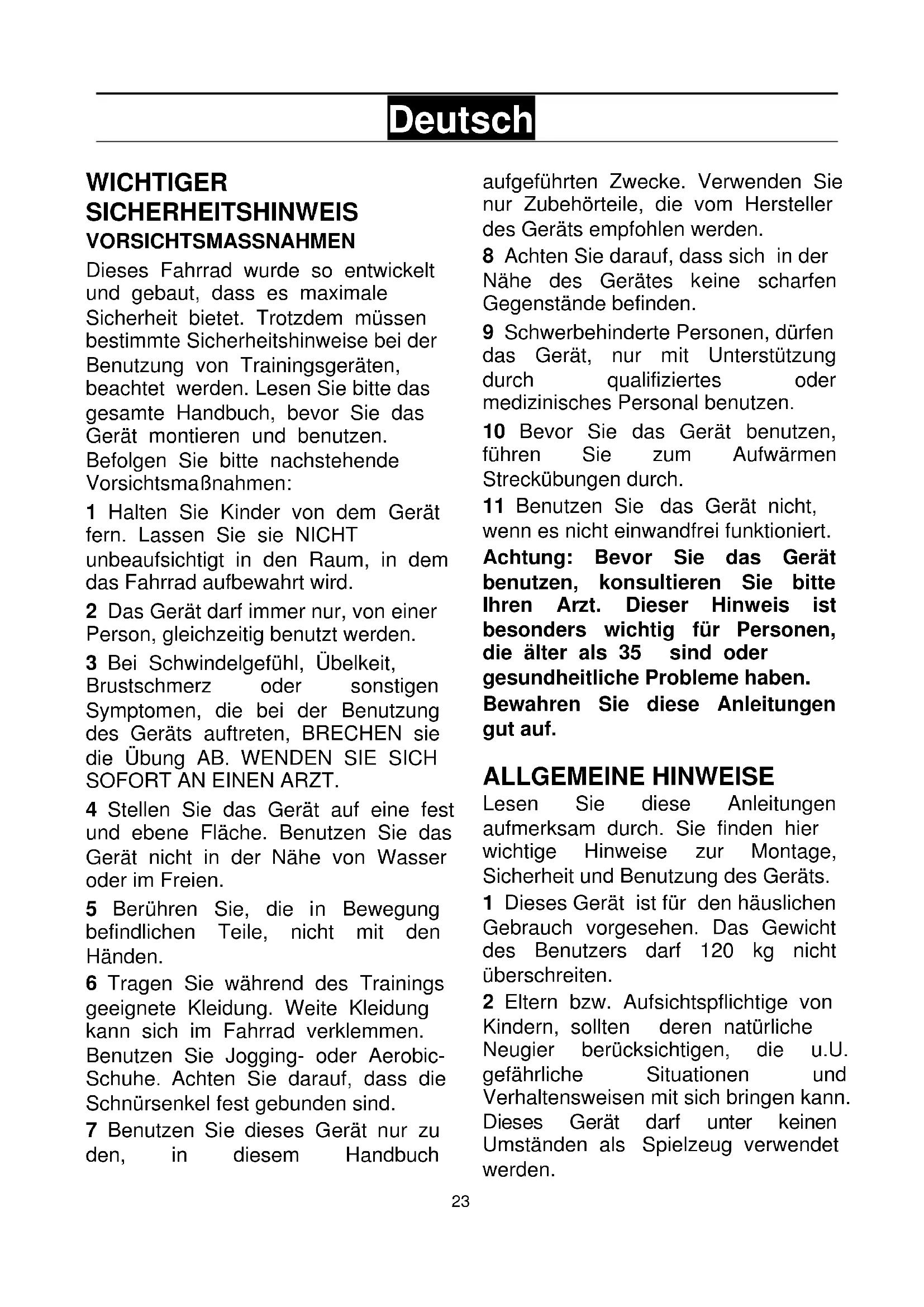 Deutsch WICHTIGER SICHERHEITSHINWEIS VORSICHTSMASSNAHMEN Dieses Fahrrad wurde so entwickelt und gebaut, dass es maximale Sicherheit bietet. Trotzdem müssen bestimmte Sicherheitshinweise bei der Benutzung von Trainingsgeräten, beachtet werden. Lesen Sie bitte das gesamte Handbuch, bevor Sie das Gerät montieren und benutzen. Befolgen Sie bitte nachstehende Vorsichtsmaßnahmen: 1 Halten Sie Kinder von dem Gerät fern. Lassen Sie sie NICHT unbeaufsichtigt in den Raum, in dem das Fahrrad aufbewahrt wird. 2 Das Gerät darf immer nur, von einer Person, gleichzeitig benutzt werden. 3 Bei Schwindelgefühl, Übelkeit, Brustschmerz oder sonstigen Symptomen, die bei der Benutzung des Geräts auftreten, BRECHEN sie die Übung AB. WENDEN SIE SICH SOFORT AN EINEN ARZT. 4 Stellen Sie das Gerät auf eine fest und ebene Fläche. Benutzen Sie das Gerät nicht in der Nähe von Wasser oder im Freien. 5 Berühren Sie, die in Bewegung befindlichen Teile, nicht mit den Händen. 6 Tragen Sie während des Trainings geeignete Kleidung. Weite Kleidung kann sich im Fahrrad verklemmen. Benutzen Sie Jogging- oder Aerobic- Schuhe. Achten Sie darauf, dass die Schnürsenkel fest gebunden sind. 7 Benutzen Sie dieses Gerät nur zu den, in diesem Handbuch aufgeführten Zwecke. Verwenden Sie nur Zubehörteile, die vom Hersteller des Geräts empfohlen werden. 8 Achten Sie darauf, dass sich in der Nähe des Gerätes keine scharfen Gegenstände befinden. 9 Schwerbehinderte Personen, dürfen das Gerät, nur mit Unterstützung durch qualifiziertes oder medizinisches Personal benutzen. 10 Bevor Sie das Gerät benutzen, führen Sie zum Aufwärmen Streckübungen durch. 11 Benutzen Sie das Gerät nicht, wenn es nicht einwandfrei funktioniert. Achtung: Bevor Sie das Gerät benutzen, konsultieren Sie bitte Ihren Arzt. Dieser Hinweis ist besonders wichtig für Personen, die älter als 35 sind oder gesundheitliche Probleme haben. Bewahren Sie diese Anleitungen gut auf. ALLGEMEINE HINWEISE Lesen Sie diese Anleitungen aufmerksam durch. Sie finden hier wichtige Hinweise zur Montage, Sicherheit und Benutzung des Geräts. 1 Dieses Gerät ist für den häuslichen Gebrauch vorgesehen. Das Gewicht des Benutzers darf 120 kg nicht überschreiten. 2 Eltern bzw. Aufsichtspflichtige von Kindern, sollten deren natürliche Neugier berücksichtigen, die u.U. gefährliche Situationen und Verhaltensweisen mit sich bringen kann. Dieses Gerät darf unter keinen Umständen als Spielzeug verwendet werden.24