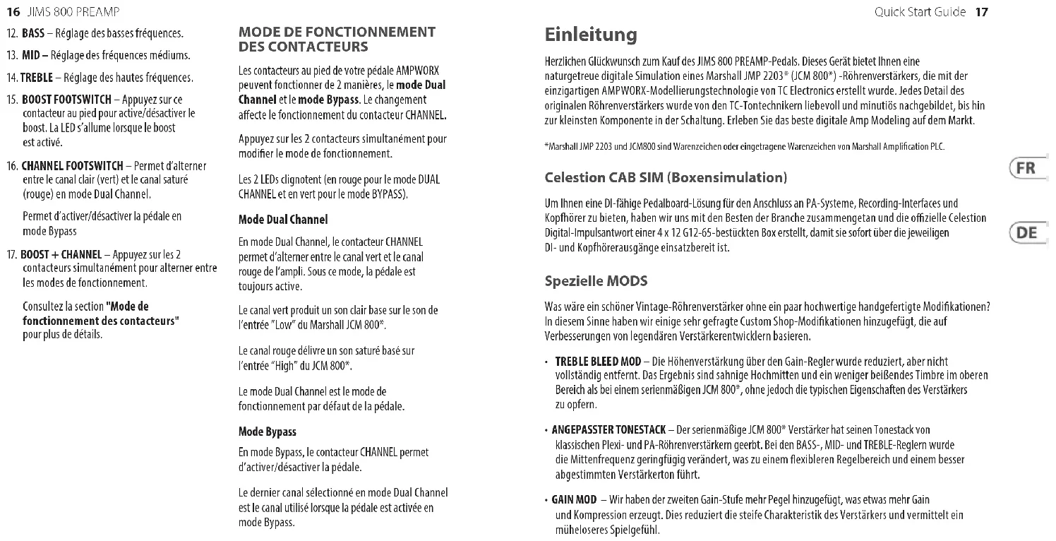 DES CONTACTEURS Les contacteurs au pied de votre pédale AMPWORX peuvent fonctionner de 2 manières, le mode Dual Channel et le mode Bypass. Le changement aecte le fonctionnement du contacteur CHANNEL. Appuyez sur les 2 contacteurs simultanément pour modier le mode de fonctionnement. Les 2 LEDs clignotent (en rouge pour le mode DUAL CHANNEL et en vert pour le mode BYPASS). Mode Dual Channel En mode Dual Channel, le contacteur CHANNEL permet d’alterner entre le canal vert et le canal rouge de l’ampli. Sous ce mode, la pédale est toujours active. Le canal vert produit un son clair base sur le son de l’entrée ”Low” du Marshall JCM 800*. Le canal rouge délivre un son saturé basé sur l’entrée “High” du JCM 800*. Le mode Dual Channel est le mode de fonctionnement par défaut de la pédale. Mode Bypass En mode Bypass, le contacteur CHANNEL permet d’activer/désactiver la pédale. Le dernier canal sélectionné en mode Dual Channel est le canal utilisé lorsque la pédale est activée en mode Bypass. Einleitung Herzlichen Glückwunsch zum Kauf des JIMS 800 PREAMP-Pedals. Dieses Gerät bietet Ihnen eine naturgetreue digitale Simulation eines Marshall JMP 2203* (JCM 800*) -Röhrenverstärkers, die mit der einzigartigen AMPWORX-Modellierungstechnologie von TC Electronics erstellt wurde. Jedes Detail des originalen Röhrenverstärkers wurde von den TC-Tontechnikern liebevoll und minutiös nachgebildet, bis hin zur kleinsten Komponente in der Schaltung. Erleben Sie das beste digitale Amp Modeling auf dem Markt. *Marshall JMP 2203 und JCM800 sind Warenzeichen oder eingetragene Warenzeichen von Marshall Amplication PLC. Celestion CAB SIM (Boxensimulation) Um Ihnen eine DI-fähige Pedalboard-Lösung für den Anschluss an PA-Systeme, Recording-Interfaces und Kopfhörer zu bieten, haben wir uns mit den Besten der Branche zusammengetan und die ozielle Celestion Digital-Impulsantwort einer 4 x 12 G12-65-bestückten Box erstellt, damit sie sofort über die jeweiligen DI- und Kopfhörerausgänge einsatzbereit ist. Spezielle MODS Was wäre ein schöner Vintage-Röhrenverstärker ohne ein paar hochwertige handgefertigte Modikationen? In diesem Sinne haben wir einige sehr gefragte Custom Shop-Modikationen hinzugefügt, die auf Verbesserungen von legendären Verstärkerentwicklern basieren.
