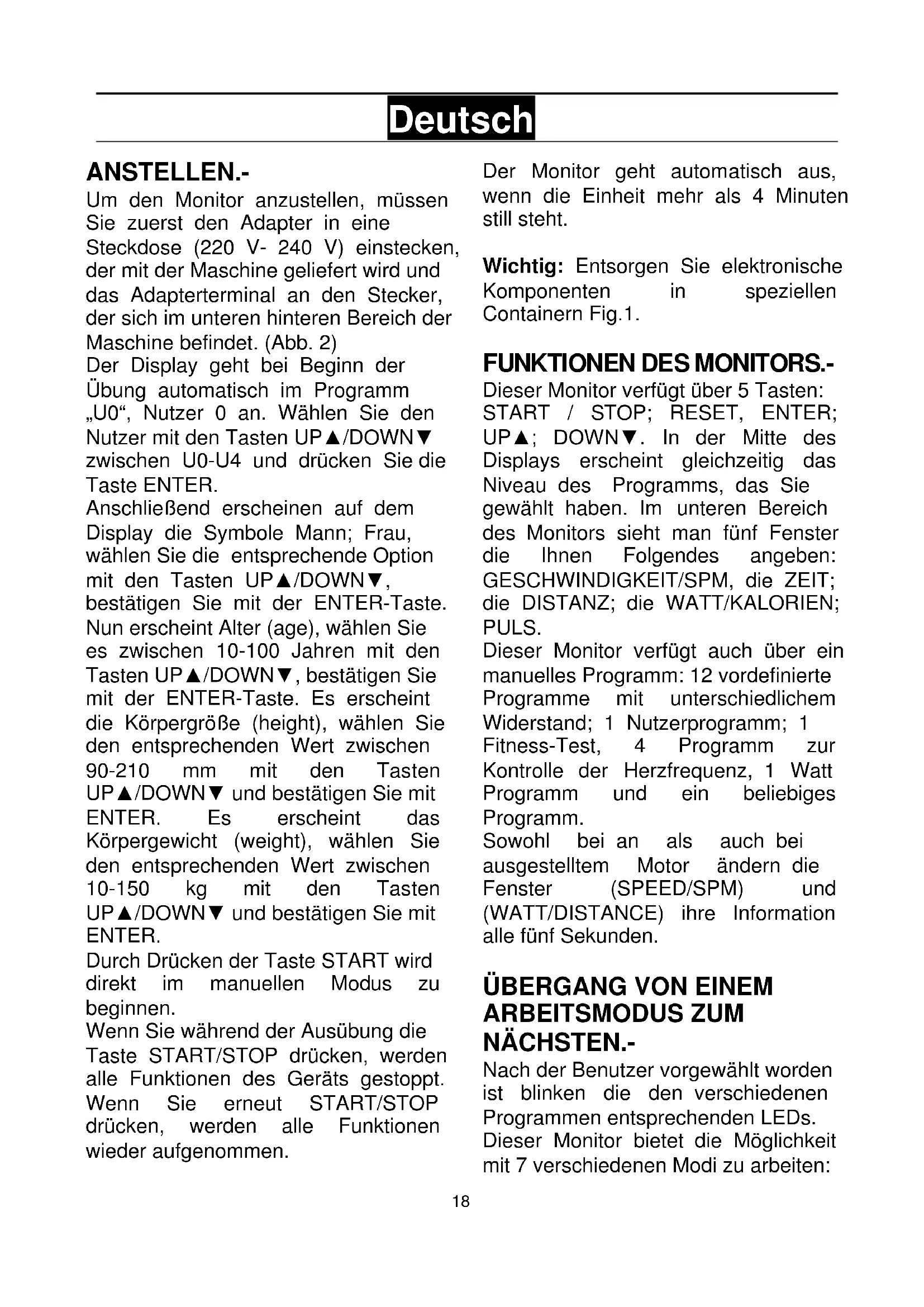 Deutsch ANSTELLEN.- Um den Monitor anzustellen, müssen Sie zuerst den Adapter in eine Steckdose (220 V- 240 V) einstecken, der mit der Maschine geliefert wird und das Adapterterminal an den Stecker, der sich im unteren hinteren Bereich der Maschine befindet. (Abb. 2) Der Display geht bei Beginn der Übung automatisch im Programm „U0“, Nutzer 0 an. Wählen Sie den Nutzer mit den Tasten UP▲/DOWN▼ zwischen U0-U4 und drücken Sie die Taste ENTER. Anschließend erscheinen auf dem Display die Symbole Mann; Frau, wählen Sie die entsprechende Option mit den Tasten UP▲/DOWN▼, bestätigen Sie mit der ENTER-Taste. Nun erscheint Alter (age), wählen Sie es zwischen 10-100 Jahren mit den Tasten UP▲/DOWN▼, bestätigen Sie mit der ENTER-Taste. Es erscheint die Körpergröße (height), wählen Sie den entsprechenden Wert zwischen 90-210 mm mit den Tasten UP▲/DOWN▼ und bestätigen Sie mit ENTER. Es erscheint das Körpergewicht (weight), wählen Sie den entsprechenden Wert zwischen 10-150 kg mit den Tasten UP▲/DOWN▼ und bestätigen Sie mit ENTER. Durch Drücken der Taste START wird direkt im manuellen Modus zu beginnen. Wenn Sie während der Ausübung die Taste START/STOP drücken, werden alle Funktionen des Geräts gestoppt. Wenn Sie erneut START/STOP drücken, werden alle Funktionen wieder aufgenommen. Der Monitor geht automatisch aus, wenn die Einheit mehr als 4 Minuten still steht. Wichtig: Entsorgen Sie elektronische Komponenten in speziellen Containern Fig.1.