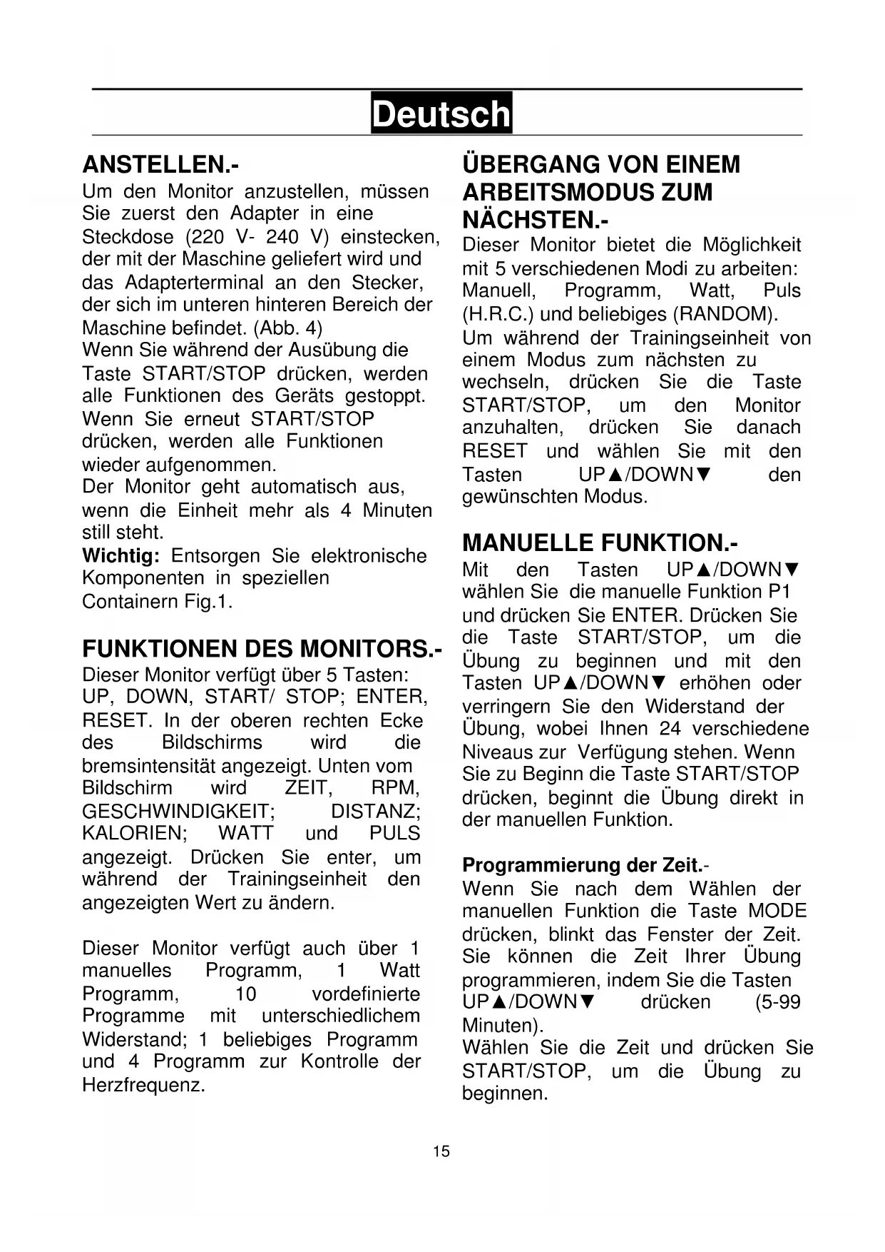 Deutsch ANSTELLEN.- Um den Monitor anzustellen, müssen Sie zuerst den Adapter in eine Steckdose (220 V- 240 V) einstecken, der mit der Maschine geliefert wird und das Adapterterminal an den Stecker, der sich im unteren hinteren Bereich der Maschine befindet. (Abb. 4) Wenn Sie während der Ausübung die Taste START/STOP drücken, werden alle Funktionen des Geräts gestoppt. Wenn Sie erneut START/STOP drücken, werden alle Funktionen wieder aufgenommen. Der Monitor geht automatisch aus, wenn die Einheit mehr als 4 Minuten still steht. Wichtig: Entsorgen Sie elektronische Komponenten in speziellen Containern Fig.1.
