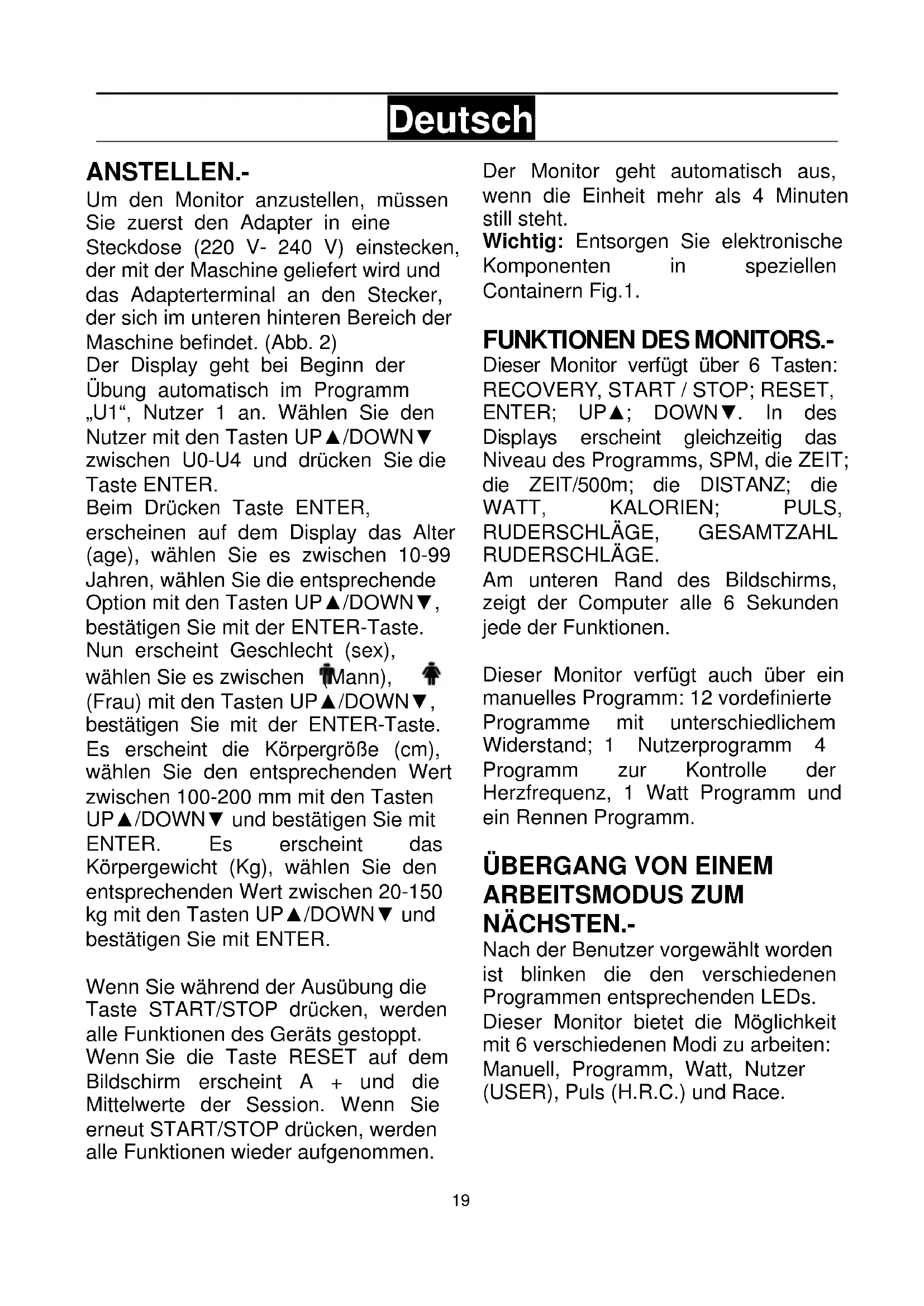 Deutsch ANSTELLEN.- Um den Monitor anzustellen, müssen Sie zuerst den Adapter in eine Steckdose (220 V- 240 V) einstecken, der mit der Maschine geliefert wird und das Adapterterminal an den Stecker, der sich im unteren hinteren Bereich der Maschine befindet. (Abb. 2) Der Display geht bei Beginn der Übung automatisch im Programm „U1“, Nutzer 1 an. Wählen Sie den Nutzer mit den Tasten UP▲/DOWN▼ zwischen U0-U4 und drücken Sie die Taste ENTER. Beim Drücken Taste ENTER, erscheinen auf dem Display das Alter (age), wählen Sie es zwischen 10-99 Jahren, wählen Sie die entsprechende Option mit den Tasten UP▲/DOWN▼, bestätigen Sie mit der ENTER-Taste. Nun erscheint Geschlecht (sex), wählen Sie es zwischen (Mann), (Frau) mit den Tasten UP▲/DOWN▼, bestätigen Sie mit der ENTER-Taste. Es erscheint die Körpergröße (cm), wählen Sie den entsprechenden Wert zwischen 100-200 mm mit den Tasten UP▲/DOWN▼ und bestätigen Sie mit ENTER. Es erscheint das Körpergewicht (Kg), wählen Sie den entsprechenden Wert zwischen 20-150 kg mit den Tasten UP▲/DOWN▼ und bestätigen Sie mit ENTER. Wenn Sie während der Ausübung die Taste START/STOP drücken, werden alle Funktionen des Geräts gestoppt. Wenn Sie die Taste RESET auf dem Bildschirm erscheint A + und die Mittelwerte der Session. Wenn Sie erneut START/STOP drücken, werden alle Funktionen wieder aufgenommen. Der Monitor geht automatisch aus, wenn die Einheit mehr als 4 Minuten still steht. Wichtig: Entsorgen Sie elektronische Komponenten in speziellen Containern Fig.1.