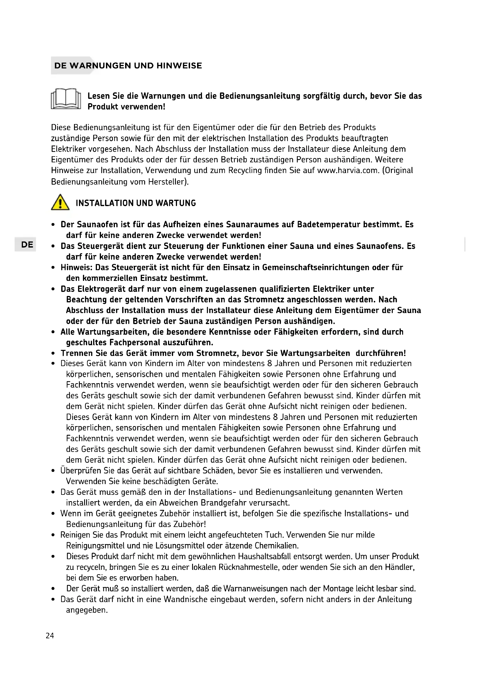 Lesen Sie die Warnungen und die Bedienungsanleitung sorgfältig durch, bevor Sie das Produkt verwenden! Diese Bedienungsanleitung ist für den Eigentümer oder die für den Betrieb des Produkts zuständige Person sowie für den mit der elektrischen Installation des Produkts beauftragten Elektriker vorgesehen. Nach Abschluss der Installation muss der Installateur diese Anleitung dem Eigentümer des Produkts oder der für dessen Betrieb zuständigen Person aushändigen. Weitere Hinweise zur Installation, Verwendung und zum Recycling finden Sie auf www.harvia.com. (Original Bedienungsanleitung vom Hersteller).