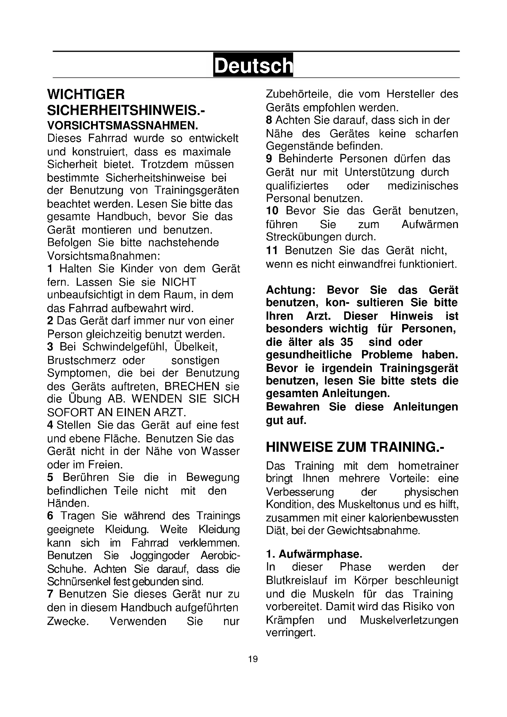 Deutsch WICHTIGER SICHERHEITSHINWEIS.- VORSICHTSMASSNAHMEN. Dieses Fahrrad wurde so entwickelt und konstruiert, dass es maximale Sicherheit bietet. Trotzdem müssen bestimmte Sicherheitshinweise bei der Benutzung von Trainingsgeräten beachtet werden. Lesen Sie bitte das gesamte Handbuch, bevor Sie das Gerät montieren und benutzen. Befolgen Sie bitte nachstehende Vorsichtsmaßnahmen: 1 Halten Sie Kinder von dem Gerät fern. Lassen Sie sie NICHT unbeaufsichtigt in dem Raum, in dem das Fahrrad aufbewahrt wird. 2 Das Gerät darf immer nur von einer Person gleichzeitig benutzt werden. 3 Bei Schwindelgefühl, Übelkeit, Brustschmerz oder sonstigen Symptomen, die bei der Benutzung des Geräts auftreten, BRECHEN sie die Übung AB. WENDEN SIE SICH SOFORT AN EINEN ARZT. 4 Stellen Sie das Gerät auf eine fest und ebene Fläche. Benutzen Sie das Gerät nicht in der Nähe von Wasser oder im Freien. 5 Berühren Sie die in Bewegung befindlichen Teile nicht mit den Händen. 6 Tragen Sie während des Trainings geeignete Kleidung. Weite Kleidung kann sich im Fahrrad verklemmen. Benutzen Sie Joggingoder Aerobic- Schuhe. Achten Sie darauf, dass die Schnürsenkel fest gebunden sind. 7 Benutzen Sie dieses Gerät nur zu den in diesem Handbuch aufgeführten Zwecke. Verwenden Sie nur Zubehörteile, die vom Hersteller des Geräts empfohlen werden. 8 Achten Sie darauf, dass sich in der Nähe des Gerätes keine scharfen Gegenstände befinden. 9 Behinderte Personen dürfen das Gerät nur mit Unterstützung durch qualifiziertes oder medizinisches Personal benutzen. 10 Bevor Sie das Gerät benutzen, führen Sie zum Aufwärmen Streckübungen durch. 11 Benutzen Sie das Gerät nicht, wenn es nicht einwandfrei funktioniert. Achtung: Bevor Sie das Gerät benutzen, kon- sultieren Sie bitte Ihren Arzt. Dieser Hinweis ist besonders wichtig für Personen, die älter als 35 sind oder gesundheitliche Probleme haben. Bevor ie irgendein Trainingsgerät benutzen, lesen Sie bitte stets die gesamten Anleitungen. Bewahren Sie diese Anleitungen gut auf.