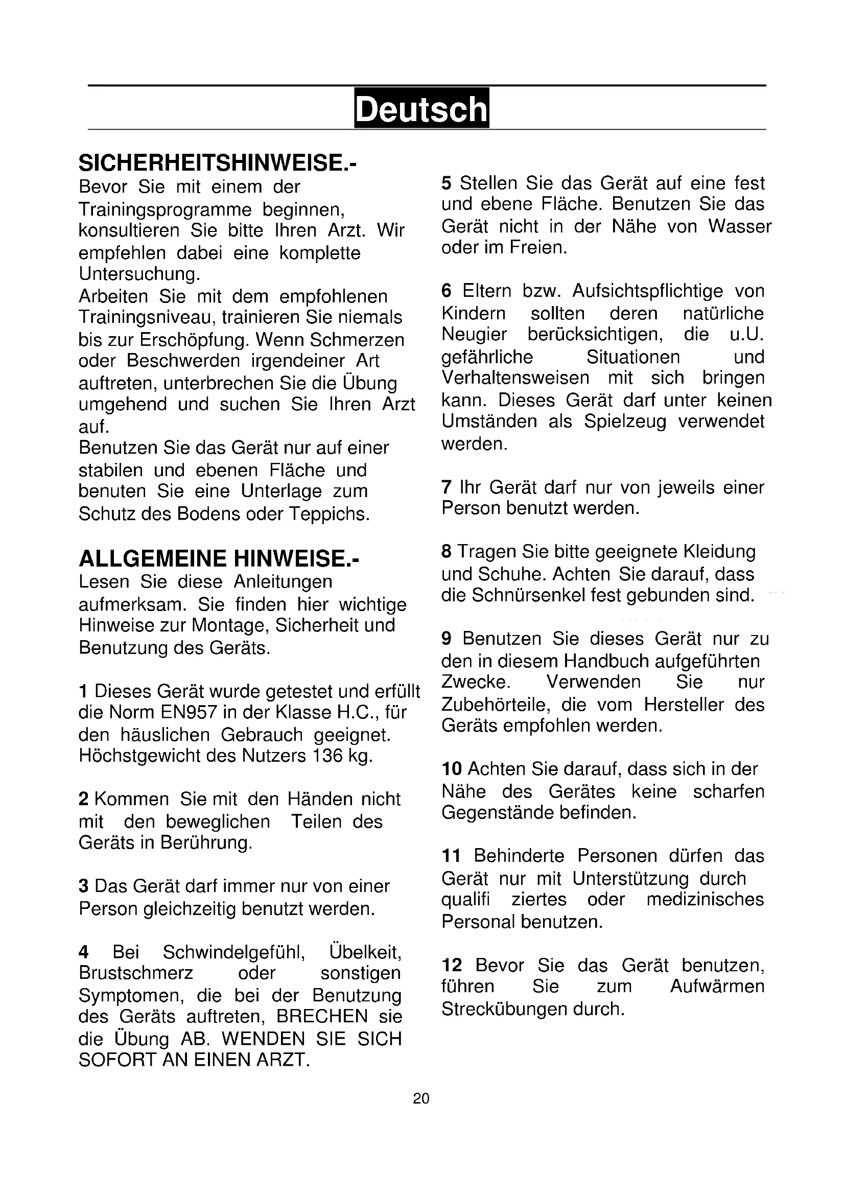 Deutsch SICHERHEITSHINWEISE.- Bevor Sie mit einem der Trainingsprogramme beginnen, konsultieren Sie bitte Ihren Arzt. Wir empfehlen dabei eine komplette Untersuchung. Arbeiten Sie mit dem empfohlenen Trainingsniveau, trainieren Sie niemals bis zur Erschöpfung. Wenn Schmerzen oder Beschwerden irgendeiner Art auftreten, unterbrechen Sie die Übung umgehend und suchen Sie Ihren Arzt auf. Benutzen Sie das Gerät nur auf einer stabilen und ebenen Fläche und benuten Sie eine Unterlage zum Schutz des Bodens oder Teppichs. ALLGEMEINE HINWEISE.- Lesen Sie diese Anleitungen aufmerksam. Sie finden hier wichtige Hinweise zur Montage, Sicherheit und Benutzung des Geräts. 1 Dieses Gerät wurde getestet und erfüllt die Norm EN957 in der Klasse H.C., für den häuslichen Gebrauch geeignet. Höchstgewicht des Nutzers 136 kg. 2 Kommen Sie mit den Händen nicht mit den beweglichen Teilen des Geräts in Berührung. 3 Das Gerät darf immer nur von einer Person gleichzeitig benutzt werden. 4 Bei Schwindelgefühl, Übelkeit, Brustschmerz oder sonstigen Symptomen, die bei der Benutzung des Geräts auftreten, BRECHEN sie die Übung AB. WENDEN SIE SICH SOFORT AN EINEN ARZT. 5 Stellen Sie das Gerät auf eine fest und ebene Fläche. Benutzen Sie das Gerät nicht in der Nähe von Wasser oder im Freien. 6 Eltern bzw. Aufsichtspflichtige von Kindern sollten deren natürliche Neugier berücksichtigen, die u.U. gefährliche Situationen und Verhaltensweisen mit sich bringen kann. Dieses Gerät darf unter keinen Umständen als Spielzeug verwendet werden. 7 Ihr Gerät darf nur von jeweils einer Person benutzt werden. 8 Tragen Sie bitte geeignete Kleidung und Schuhe. Achten Sie darauf, dass die Schnürsenkel fest gebunden sind. 9 Benutzen Sie dieses Gerät nur zu den in diesem Handbuch aufgeführten Zwecke. Verwenden Sie nur Zubehörteile, die vom Hersteller des Geräts empfohlen werden. 10 Achten Sie darauf, dass sich in der Nähe des Gerätes keine scharfen Gegenstände befinden. 11 Behinderte Personen dürfen das Gerät nur mit Unterstützung durch qualifi ziertes oder medizinisches Personal benutzen. 12 Bevor Sie das Gerät benutzen, führen Sie zum Aufwärmen Streckübungen durch.21