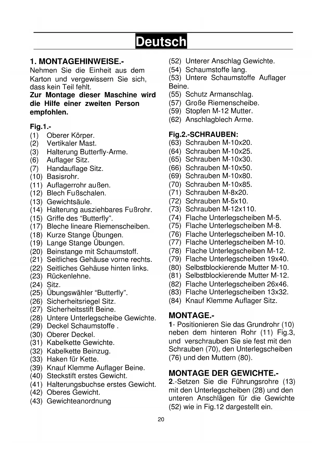 Nehmen Sie die Einheit aus dem Karton und vergewissern Sie sich, dass kein Teil fehlt. Zur Montage dieser Maschine wird die Hilfe einer zweiten Person empfohlen. Fig.1.- (1) Oberer Körper. (2) Vertikaler Mast. (3) Halterung Butterfly-Arme. (6) Auflager Sitz. (7) Handauflage Sitz. (10) Basisrohr. (11) Auflagerrohr außen. (12) Blech Fußschalen. (13) Gewichtsäule. (14) Halterung ausziehbares Fußrohr. (15) Griffe des “Butterfly”. (17) Bleche lineare Riemenscheiben. (18) Kurze Stange Übungen. (19) Lange Stange Übungen. (20) Beinstange mit Schaumstoff. (21) Seitliches Gehäuse vorne rechts. (22) Seitliches Gehäuse hinten links. (23) Rückenlehne. (24) Sitz. (25) Übungswähler “Butterfly”. (26) Sicherheitsriegel Sitz. (27) Sicherheitsstift Beine. (28) Untere Unterlegscheibe Gewichte. (29) Deckel Schaumstoffe . (30) Oberer Deckel. (31) Kabelkette Gewichte. (32) Kabelkette Beinzug. (33) Haken für Kette. (39) Knauf Klemme Auflager Beine. (40) Steckstift erstes Gewicht. (41) Halterungsbuchse erstes Gewicht. (42) Oberes Gewicht. (43) Gewichteanordnung (52) Unterer Anschlag Gewichte. (54) Schaumstoffe lang. (53) Untere Schaumstoffe Auflager Beine. (55) Schutz Armanschlag. (57) Große Riemenscheibe. (59) Stopfen M-12 Mutter. (62) Anschlagblech Arme. Fig.2.-SCHRAUBEN: (63) Schrauben M-10x20. (64) Schrauben M-10x25. (65) Schrauben M-10x30. (66) Schrauben M-10x50. (69) Schrauben M-10x80. (70) Schrauben M-10x85. (71) Schrauben M-8x20. (72) Schrauben M-5x10. (73) Schrauben M-12x110. (74) Flache Unterlegscheiben M-5. (75) Flache Unterlegscheiben M-8. (76) Flache Unterlegscheiben M-10. (77) Flache Unterlegscheiben M-10. (78) Flache Unterlegscheiben M-12. (79) Flache Unterlegscheiben 19x40. (80) Selbstblockierende Mutter M-10. (81) Selbstblockierende Mutter M-12. (82) Flache Unterlegscheiben 26x46. (83) Flache Unterlegscheiben 13x32. (84) Knauf Klemme Auflager Sitz. MONTAGE.-