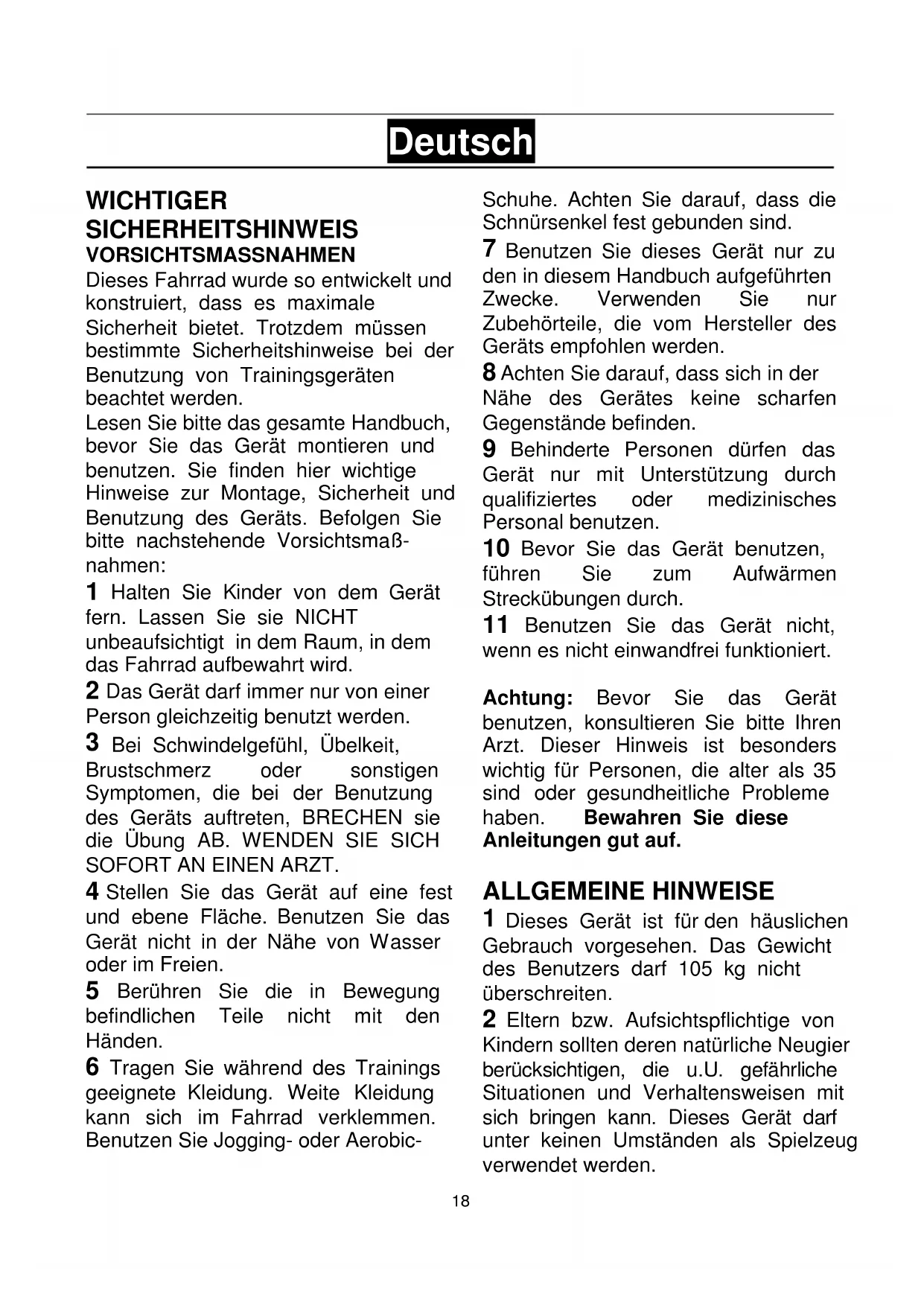 Deutsch WICHTIGER SICHERHEITSHINWEIS VORSICHTSMASSNAHMEN Dieses Fahrrad wurde so entwickelt und konstruiert, dass es maximale Sicherheit bietet. Trotzdem müssen bestimmte Sicherheitshinweise bei der Benutzung von Trainingsgeräten beachtet werden. Lesen Sie bitte das gesamte Handbuch, bevor Sie das Gerät montieren und benutzen. Sie finden hier wichtige Hinweise zur Montage, Sicherheit und Benutzung des Geräts. Befolgen Sie bitte nachstehende Vorsichtsmaß- nahmen: