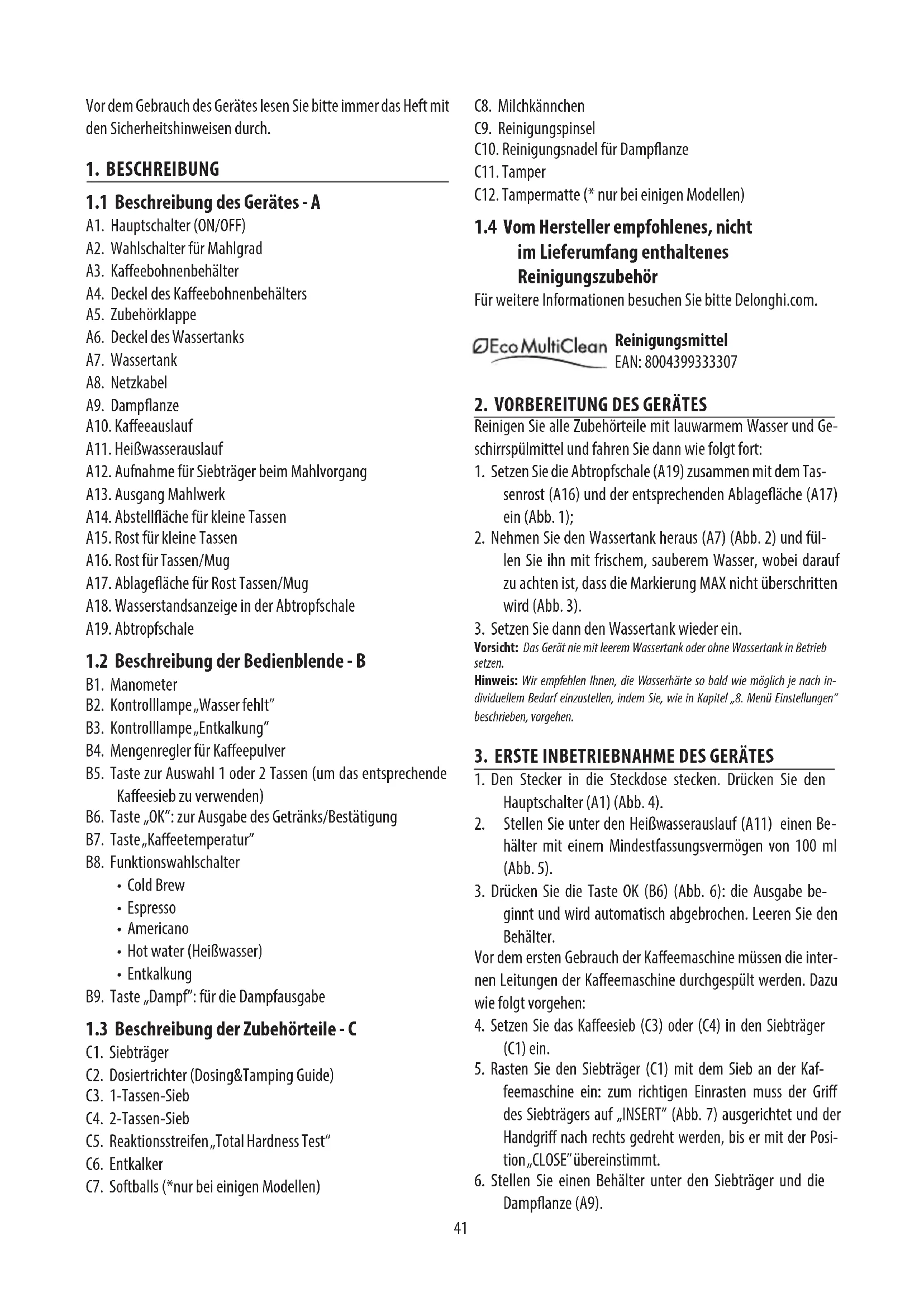 Vorsicht! • Vor dem Gebrauch lesen Sie bitte die Gebrauchsanweisung und die Angaben auf dem Etikett des Entkalkers (C6) durch, die sich auf der Packung des Entkalkers benden.• Verwenden Sie ausschließlich Entkalker von De’Longhi. Die Verwendung von ungeeigneten Entkalkern sowie die nicht regelmäßig durchgeführte Entkalkung können zum Auf-treten vom Defekten führen, die nicht durch die Hersteller-garantie abgedeckt sind.• Der Entkalker kann empndliche Oberächen beschädi-gen. Sollte das Produkt versehentlich verschüttet werden, bitte sofort wegwischen.Zur Durchführung der EntkalkungEntkalker Entkalker De’LonghiBehälter Fassungsvermögen 2 LiterZur Durchführung der EntkalkungZeit ~40min1. Die Entkalkung muss durchgeführt werden, wenn sich die Kontrolllampe einschaltet (B3). Die Entkalkung kann jederzeit gestartet werden.2. Ziehen Sie die Abtropfschale (A19) heraus, leeren Sie sie und setzen Sie sie dann wieder ein.3. Leeren Sie den Wassertank (A7). (Falls vorhanden, entfernen Sie die Softballs und legen Sie sie in ein Glas Wasser, bis sie nach Beendigung der Entkalkung wieder in den Wassertank gegeben werden)4. Geben Sie den Entkalker (C6) bis zum auf der Innenseite des Tanks aufgedruckten Füllstand A in den Wassertank (entspricht einer 100ml Packung) (Abb. 37).5. Füllen Sie bis zum Füllstand B mit Wasser auf (1 Liter) (Abb. 38). Setzen Sie dann den Wassertank wieder in die Kaeemaschine ein.