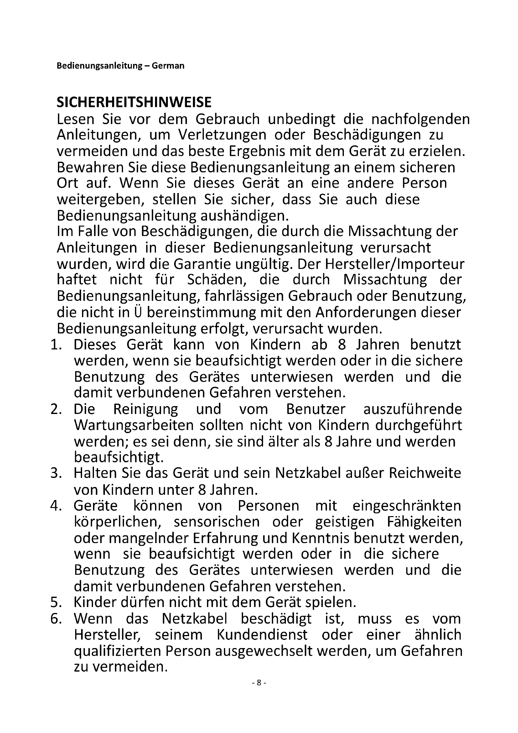 1. Dieses Gerät kann von Kindern ab 8 Jahren benutzt