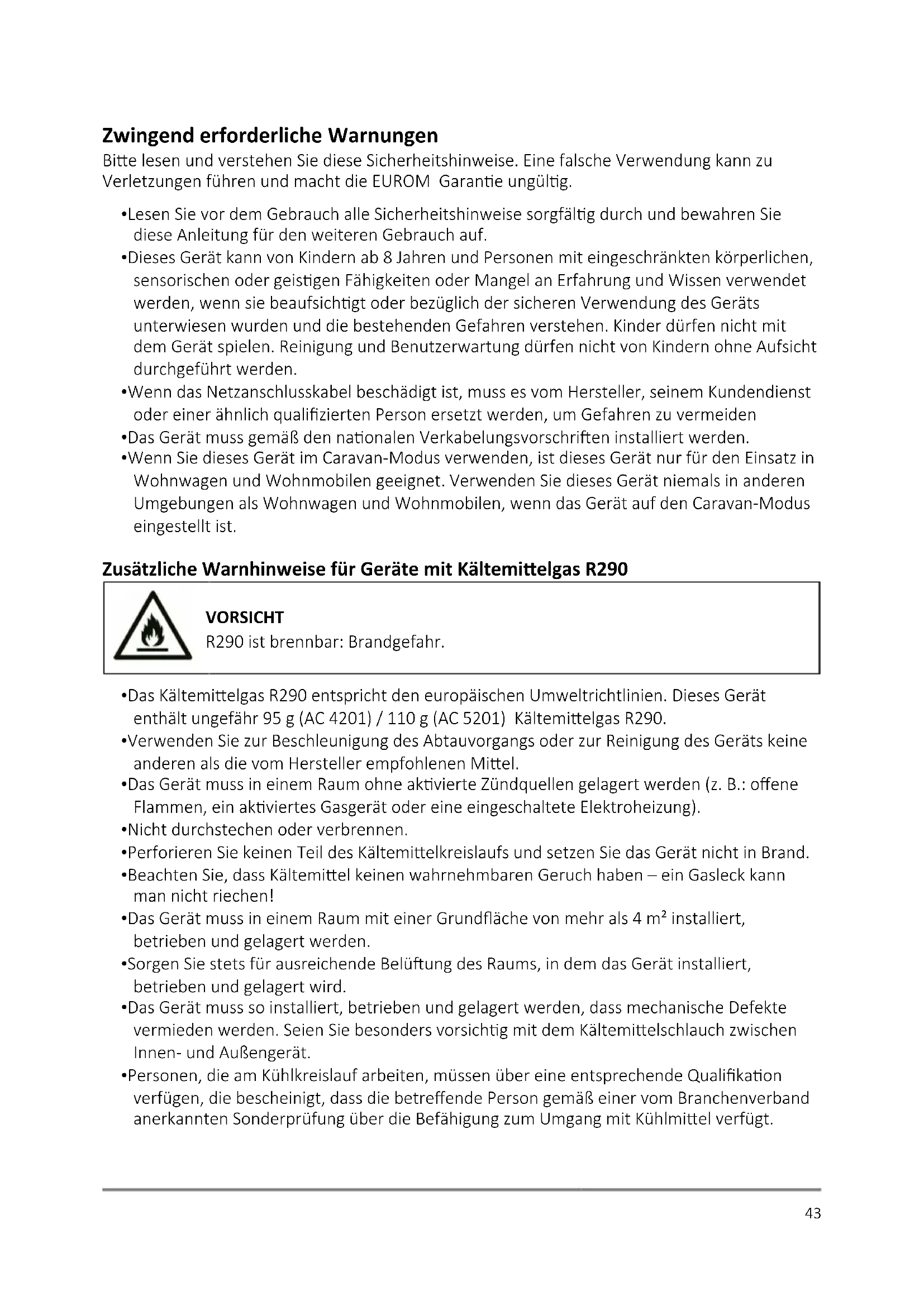 - Wenn Sie dieses Gerät im Caravan-Modus verwenden, ist dieses Gerät nur für den Einsatz in Wohnwagen und Wohnmobilen geeignet. Verwenden Sie dieses Gerät niemals in anderen Umgebungen als Wohnwagen und Wohnmobilen, wenn das Gerät auf den Caravan-Modus eingestellt ist. Zusätzliche Warnhinweise für Geräte mit Kältemielgas R290 VORSICHT R290 ist brennbar: Brandgefahr.
