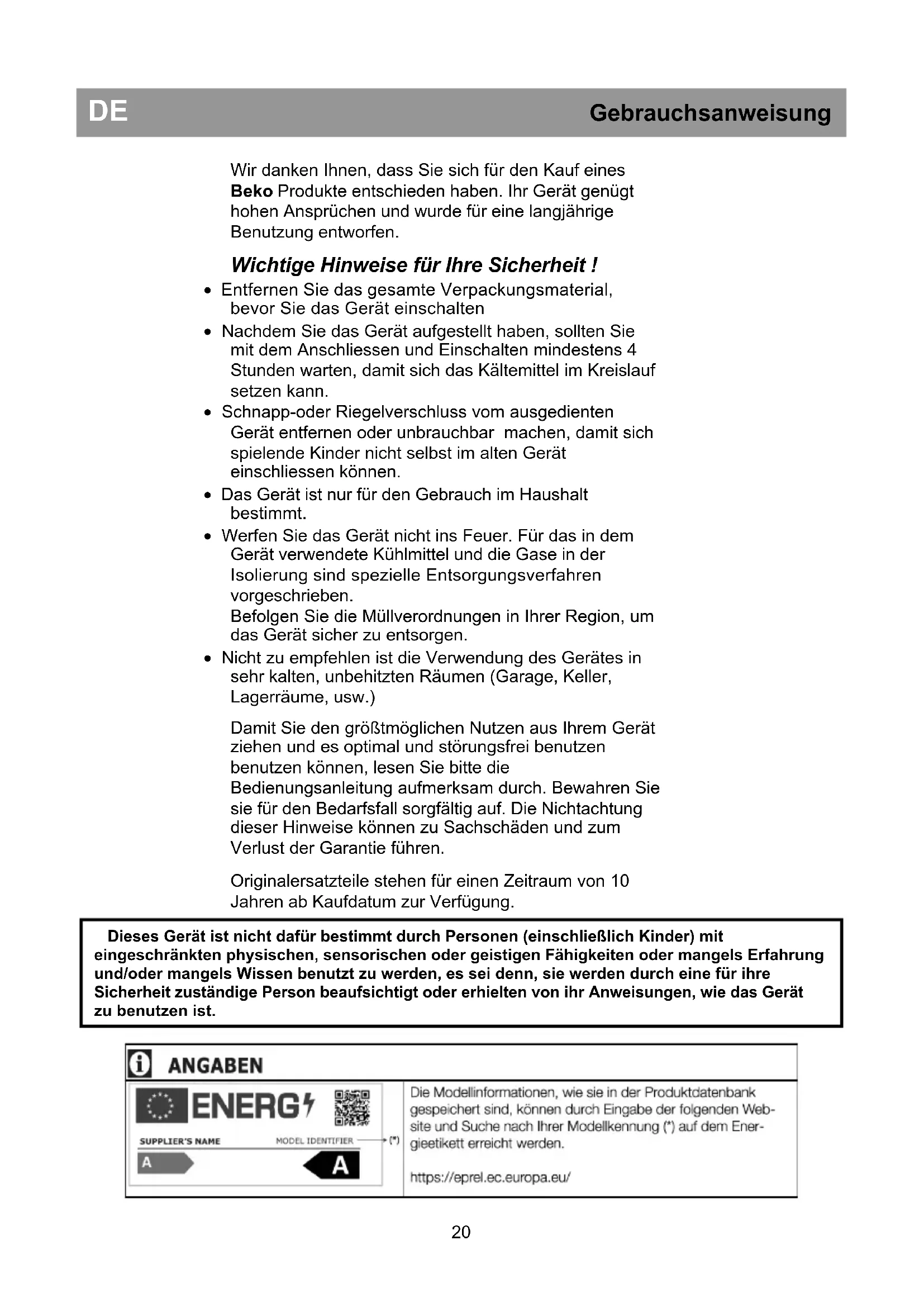 - That the new plug is wired correctly, if you have changed the fitted, moulded plug. If the appliance is still not operating at all after above checks, contact the dealer from whom you purchased the unit. Please ensure that above checks have been done, as a charge will be made if no fault is found. 19Wir danken Ihnen, dass Sie sich für den Kauf eines Beko Produkte entschieden haben. Ihr Gerät genügt hohen Ansprüchen und wurde für eine langjährige Benutzung entworfen. Wichtige Hinweise für Ihre Sicherheit !
