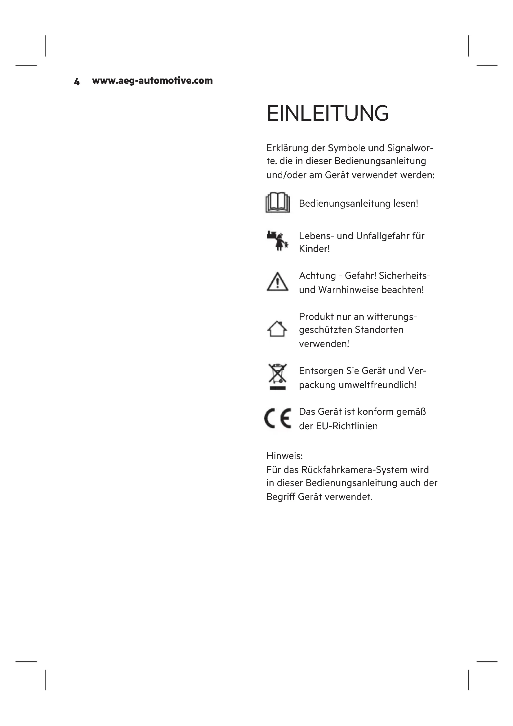 EINLEITUNG Erklärung der Symbole und Signalwor- te, die in dieser Bedienungsanleitung und/oder am Gerät verwendet werden: Bedienungsanleitung lesen! Lebens- und Unfallgefahr für Kinder! Achtung - Gefahr! Sicherheits- und Warnhinweise beachten! Produkt nur an witterungs- geschützten Standorten verwenden! Entsorgen Sie Gerät und Ver- packung umweltfreundlich! Das Gerät ist konform gemäß der EU-Richtlinien Hinweis: Für das Rückfahrkamera-System wird in dieser Bedienungsanleitung auch der Begri Gerät verwendet.Deutsch