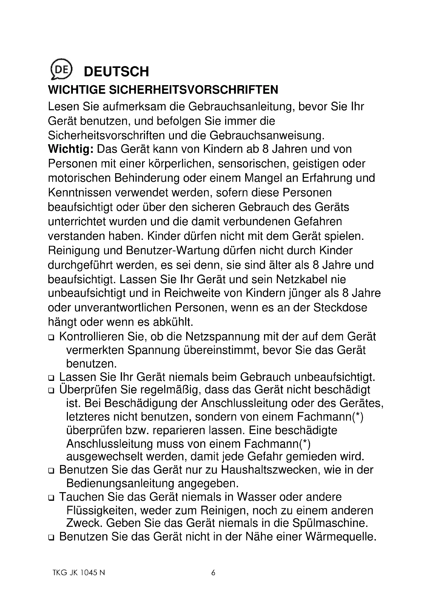 ❑ Lassen Sie den Wasserkocher abkühlen und ziehen Sie den Stecker aus der Steckdose bevor Sie das Gerät reinigen oder aufräumen. ❑ Benutzen Sie das Gerät nicht im Freien und bewahren Sie es an einem trockenen Platz auf. ❑ Benutzen Sie nur Zubehör, welches vom Lieferanten empfohlen wurde. Anderes Zubehör stellt eine Gefahr für den Benutzer dar und das Gerät könnte dadurch beschädigt werden. ❑ Ziehen Sie niemals an der Anschlussleitung um das Gerät zu bewegen. Achten Sie darauf, dass die Anschlussleitung nicht irgendwo hängen bleibt und dies zum Fall des Gerätes führen könnte. Wickeln Sie die Anschlussleitung nicht um das Gerät oder knicken Sie diese nicht. ❑ Stellen Sie das Gerät bzw. den Sockel auf eine stabile, ebene Fläche. ❑ Ist Ihr Modell mit einem separaten Sockel oder einer abtrennbaren Anschlussleitung ausgestattet, so entfernen Sie diese Teile bevor Sie den Wasserkocher mit Wasser füllen. Ist Ihr Wasserkocher mit einer festen Anschlussleitung ausgestattet, ziehen Sie dann erst den Stecker aus der Steckdose, bevor Sie den Wasserkocher füllen. ❑ Achten Sie darauf, dass der Wasserkocher zwischen der Maximum- und Minimummarkierung gefüllt wird. Überprüfen Sie stets ob der Wasserstand nicht unter die Minimummarkierung gelangt, da dies zu Beschädigungen des Heizelementes führen könnte. Achtung! Wenn Sie zuviel Wasser einfüllen, kann der Wasserkocher überkochen und kochendes Wasser kann herausspritzen. ❑ Bei Gebrauch des Gerätes sollte der Deckel sachgemäß geschlossen sein. Öffnen Sie erst dann den Deckel, wenn sich der Wasserkocher selbst abgeschaltet hat. ❑ Achten Sie darauf, dass Sie sich nicht verbrennen, da beim Kochvorgang heißer Dampf entweichen kann. ❑ Ist Ihr Wasserkocher mit einem separaten Sockel ausgestattet, so darf der Wasserkocher nur mit diesem Sockel benutzt werden.TKG JK 1045 N