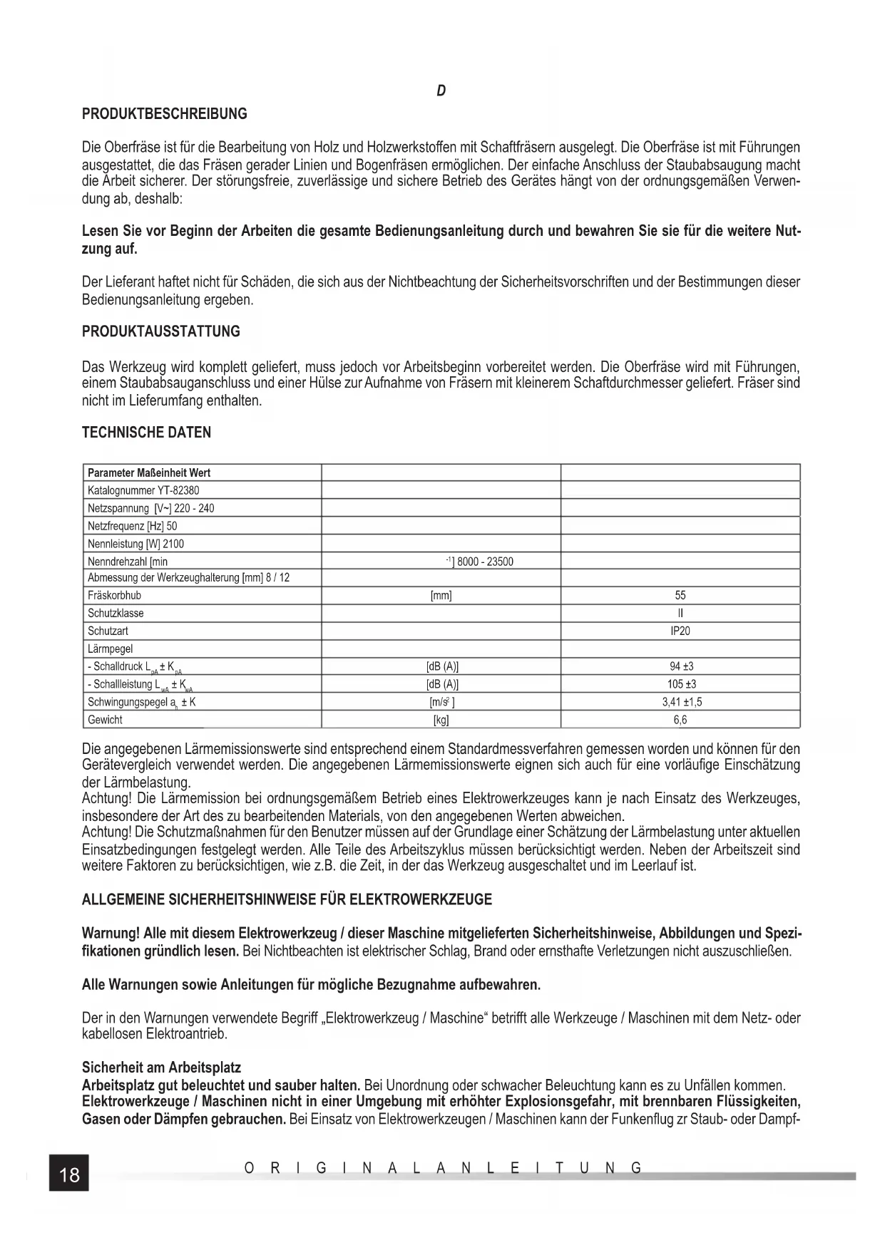 ACHTUNG! Stecker des Stromkabels vor jeder Einstellung, Inspektion oder Reinigung ziehen. Nach beendetem Einsatz sind die Komponenten des das Elektrowerkzeugs: Gerätekörper und Haltegriff , Stromkabel mit Stecker und Flexhalterung auf Beschaff en- heit visuell, Steuerschalter auf Funktion, Lüftungsschlitze auf Durchgängigkeit, Kohlenbürsten auf Funkenbildung, Lager und Ge- triebe auf Geräusche, das Werkzeug selbst auf fehlerfreien Start und gleichmäßigen Lauf zu prüfen und zu beurteilen. Während der Garantiedauer ist es dem Betreiber nicht erlaubt, das Gerät zu demontieren sowie andere Komponenten oder Bestandteile als die folgend genannten, bei sonstigem Verlust der Garantieansprüche, auszutauschen. Sämtliche Unregelmäßigkeiten, die während des Betriebes oder bei einer Inspektion festgestellt, werden, sind ein Anzeichen für eine in der Vertragswerkstatt an- stehende Reparatur, dazu sollte der Hersteller kontaktiert werden. Gehäuse, Lüftungsschlitze, Schalter, Zusatzhandgriff und Schutzverkleidungen nach beendeter Arbeit bspw. mit Druckluft (bei maximal 0,3 MPa), mit einem Pinsel oder einem trockenen Lappen ohne Chemie- und Reinigungsmittel reinigen. Keine scharfen Gegenstände für die Reinigung verwenden. Demontieren Sie die Kreissäge und reinigen Sie die Innenseite der Abdeckungen, die Befestigung der Kreissäge sowie die Säge selbst von Staub und anderen Verunreinigungen, die während des Betriebs entstehen. Reinigen Sie Griff e, Knöpfe und andere Verstellele- mente mit einem trockenen, sauberen Tuch.24 ОРИГИНАЛЬНАЯ ИНСТРУКЦИЯ RUS ХАРАКТЕРИСТИКИ ПРОДУКТА Фрезерный станок используется для обработки древесины и древесных материалов с помощью хвостовых фрез. Фре- зерный станок оснащен направляющими для прямого и изогнутого фрезерования. Возможность легкого подключения пы- леулавливающего устройства делает работу более безопасной. Правильная, надежная и безопасная работа устройства зависит от правильной эксплуатации, поэтому: Прежде чем приступить к работе с инструментом, необходимо прочитать все руководство и сохранить его. За ущерб, возникший в результате несоблюдения правил техники безопасности и рекомендаций настоящего руководства, поставщик не несет ответственности. ОСНАЩЕНИЕ УСТРОЙСТВА Устройство поставляется в комплектном состоянии, но требует проведения подготовительных действий перед началом использования. Фрезерный станок поставляется с направляющими шинами, соединениями пылеулавливающего устрой- ства и муфтой для монтажа фрез с меньшим диаметром патрона. Фрезы не входят в комплект поставки. ТЕХНИЧЕСКИЕ ХАРАКТЕРИСТИКИ Параметр Единица измерения Значение Каталожный № YT-82380 Сетевое напряжение [В~] 220 - 240 Частота тока [Гц]50 Номинальная мощность [Вт] 2100 Номинальные обороты [мин