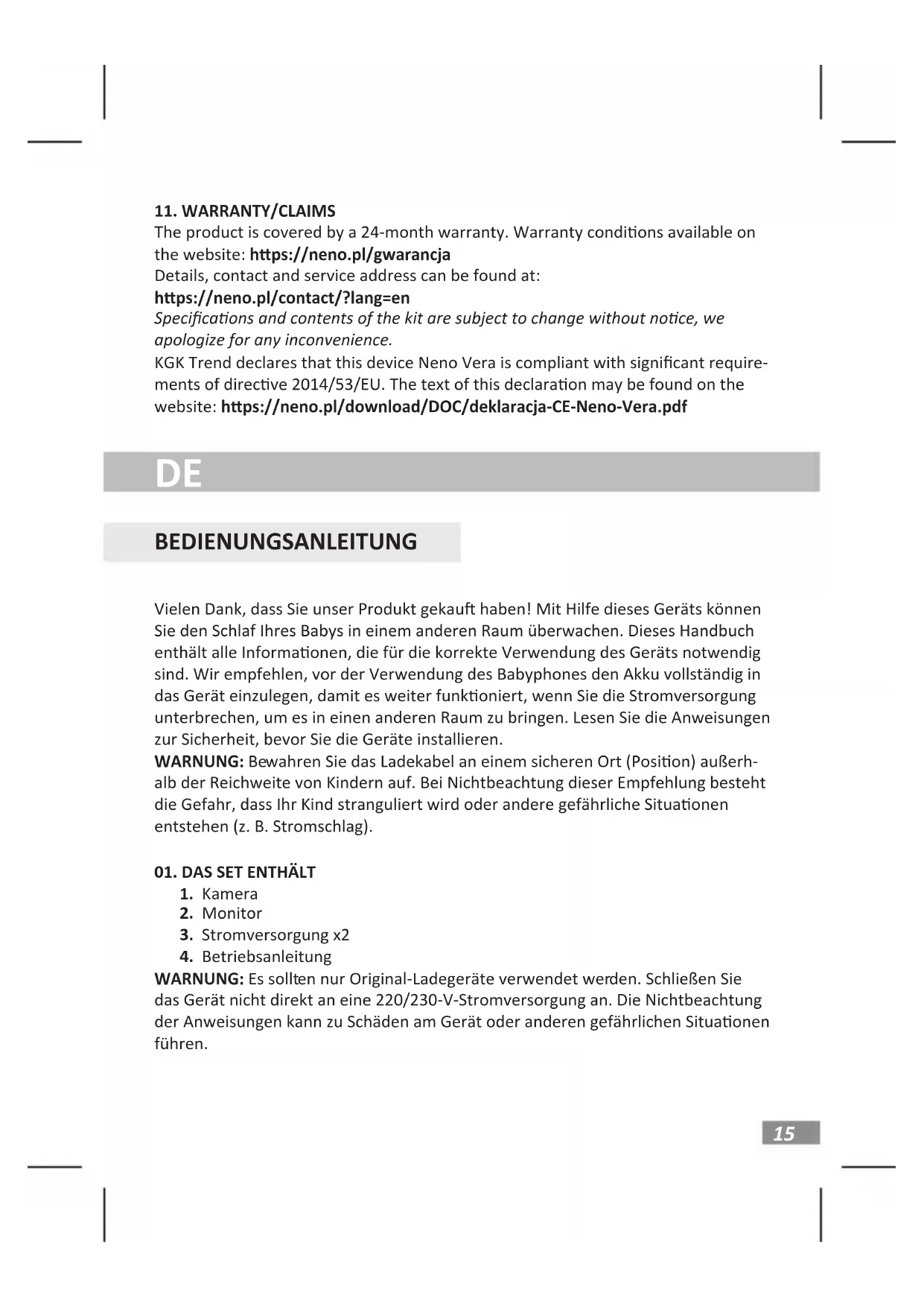 The product is covered by a 24-month warranty. Warranty condions available on the website: hps://neno.pl/gwarancja Details, contact and service address can be found at: hps://neno.pl/contact/?lang=en Specicaons and contents of the kit are subject to change without noce, we apologize for any inconvenience. KGK Trend declares that this device Neno Vera is compliant with signicant require- ments of direcve 2014/53/EU. The text of this declaraon may be found on the website: hps://neno.pl/download/DOC/deklaracja-CE-Neno-Vera.pdf Vielen Dank, dass Sie unser Produkt gekau haben! Mit Hilfe dieses Geräts können Sie den Schlaf Ihres Babys in einem anderen Raum überwachen. Dieses Handbuch enthält alle Informaonen, die für die korrekte Verwendung des Geräts notwendig sind. Wir empfehlen, vor der Verwendung des Babyphones den Akku vollständig in das Gerät einzulegen, damit es weiter funkoniert, wenn Sie die Stromversorgung unterbrechen, um es in einen anderen Raum zu bringen. Lesen Sie die Anweisungen zur Sicherheit, bevor Sie die Geräte installieren. WARNUNG: Bewahren Sie das Ladekabel an einem sicheren Ort (Posion) außerh- alb der Reichweite von Kindern auf. Bei Nichtbeachtung dieser Empfehlung besteht die Gefahr, dass Ihr Kind stranguliert wird oder andere gefährliche Situaonen entstehen (z. B. Stromschlag).