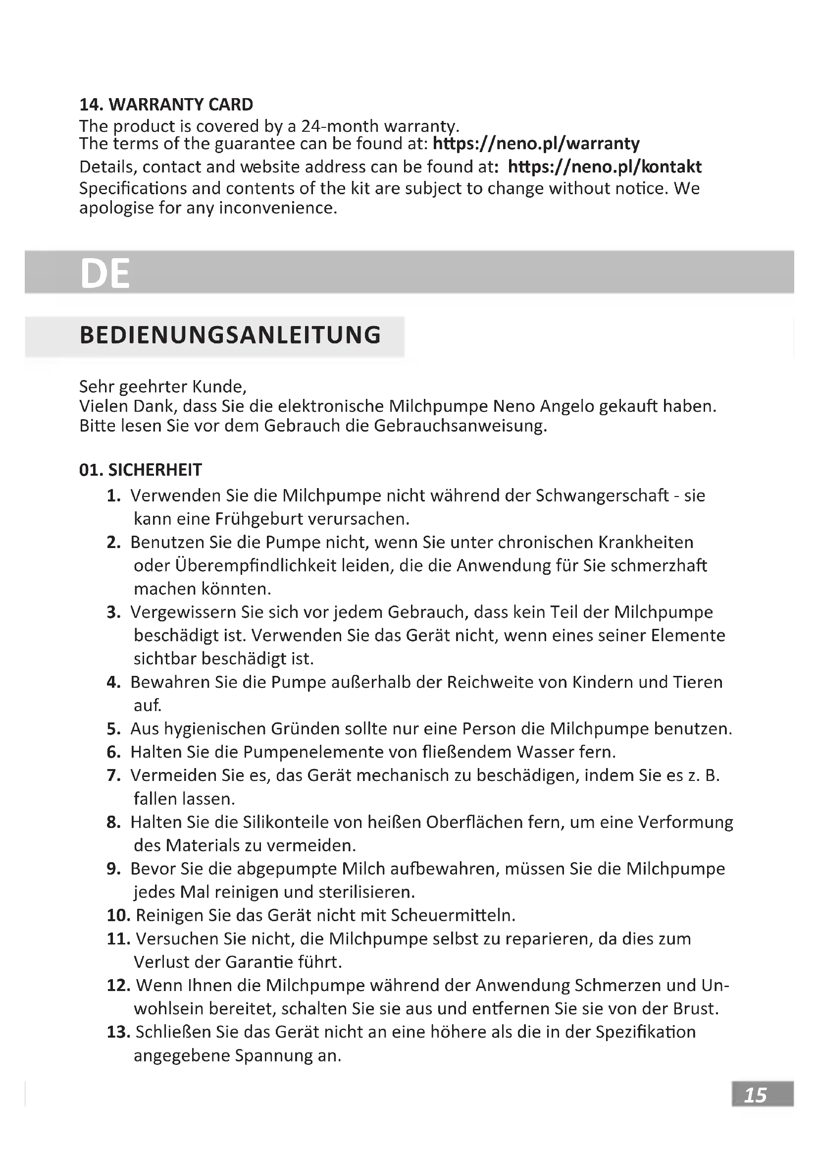 BEDIENUNGSANLEITUNG Sehr geehrter Kunde, Vielen Dank, dass Sie die elektronische Milchpumpe Neno Angelo gekau haben. Bie lesen Sie vor dem Gebrauch die Gebrauchsanweisung.