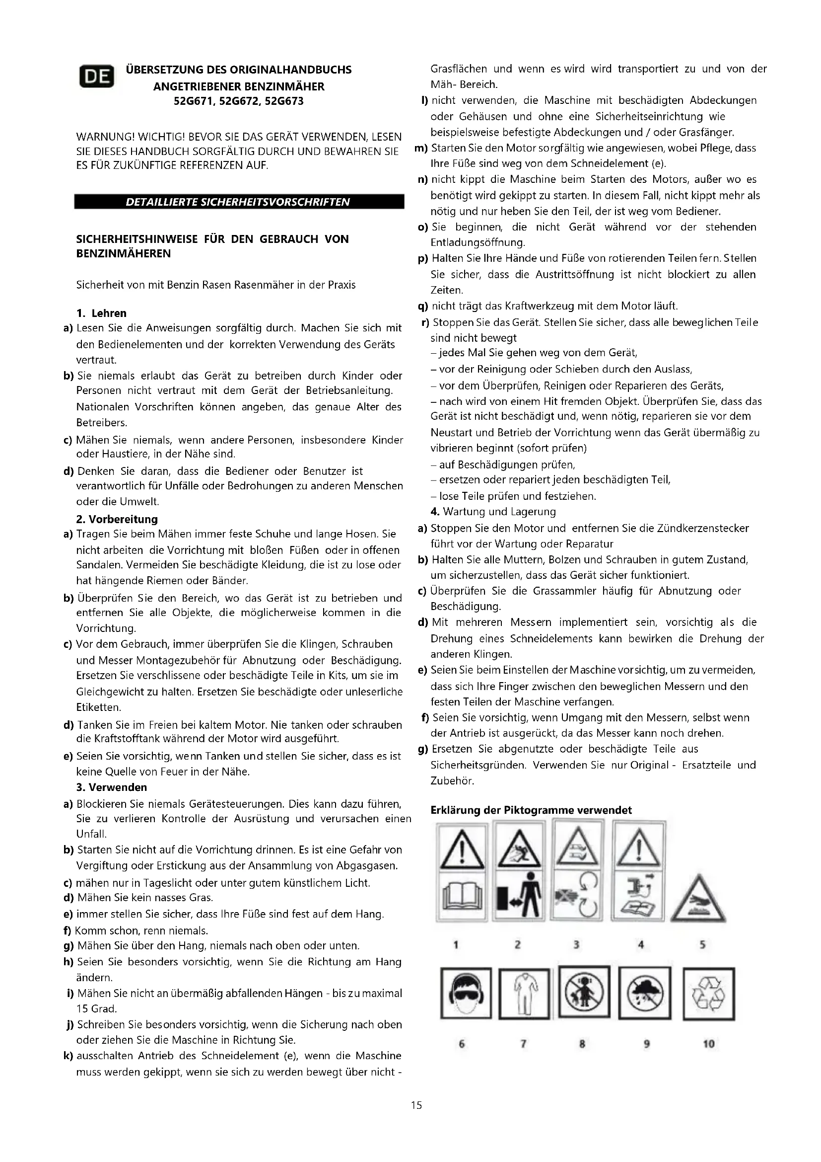 a) Stoppen Sie den Motor und entfernen Sie die Zündkerzenstecker führt vor der Wartung oder Reparatur b) Halten Sie alle Muttern, Bolzen und Schrauben in gutem Zustand, um sicherzustellen, dass das Gerät sicher funktioniert. c) Überprüfen Sie die Grassammler häufig für Abnutzung oder Beschädigung. d) Mit mehreren Messern implementiert sein, vorsichtig als die Drehung eines Schneidelements kann bewirken die Drehung der anderen Klingen. e) Seien Sie beim Einstellen der Maschine vorsichtig, um zu vermeiden, dass sich Ihre Finger zwischen den beweglichen Messern und den festen Teilen der Maschine verfangen. f) Seien Sie vorsichtig, wenn Umgang mit den Messern, selbst wenn der Antrieb ist ausgerückt, da das Messer kann noch drehen. g) Ersetzen Sie abgenutzte oder beschädigte Teile aus Sicherheitsgründen. Verwenden Sie nur Original - Ersatzteile und Zubehör. Erklärung der Piktogramme verwendet16