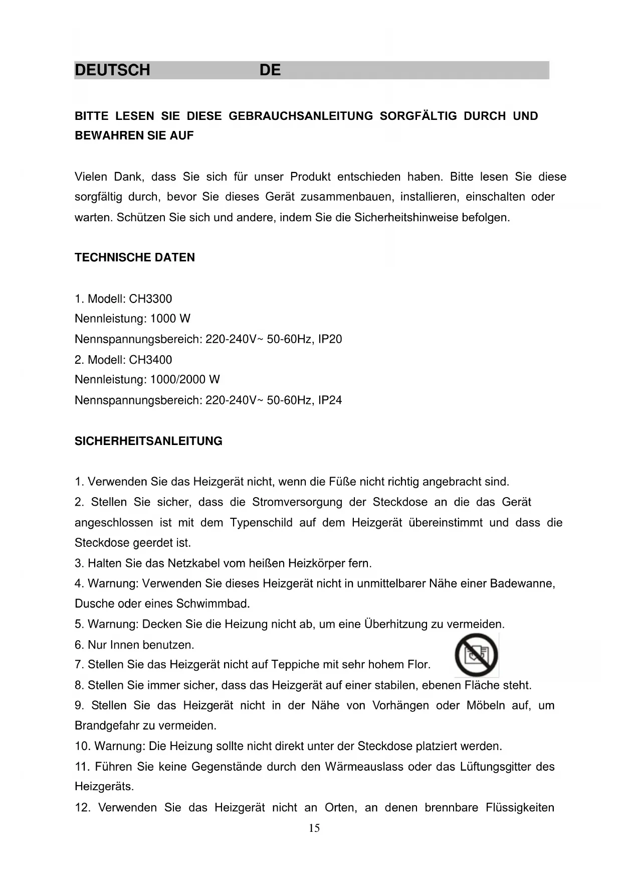 12. Verwenden Sie das Heizgerät nicht an Orten, an denen brennbare Flüssigkeiten16