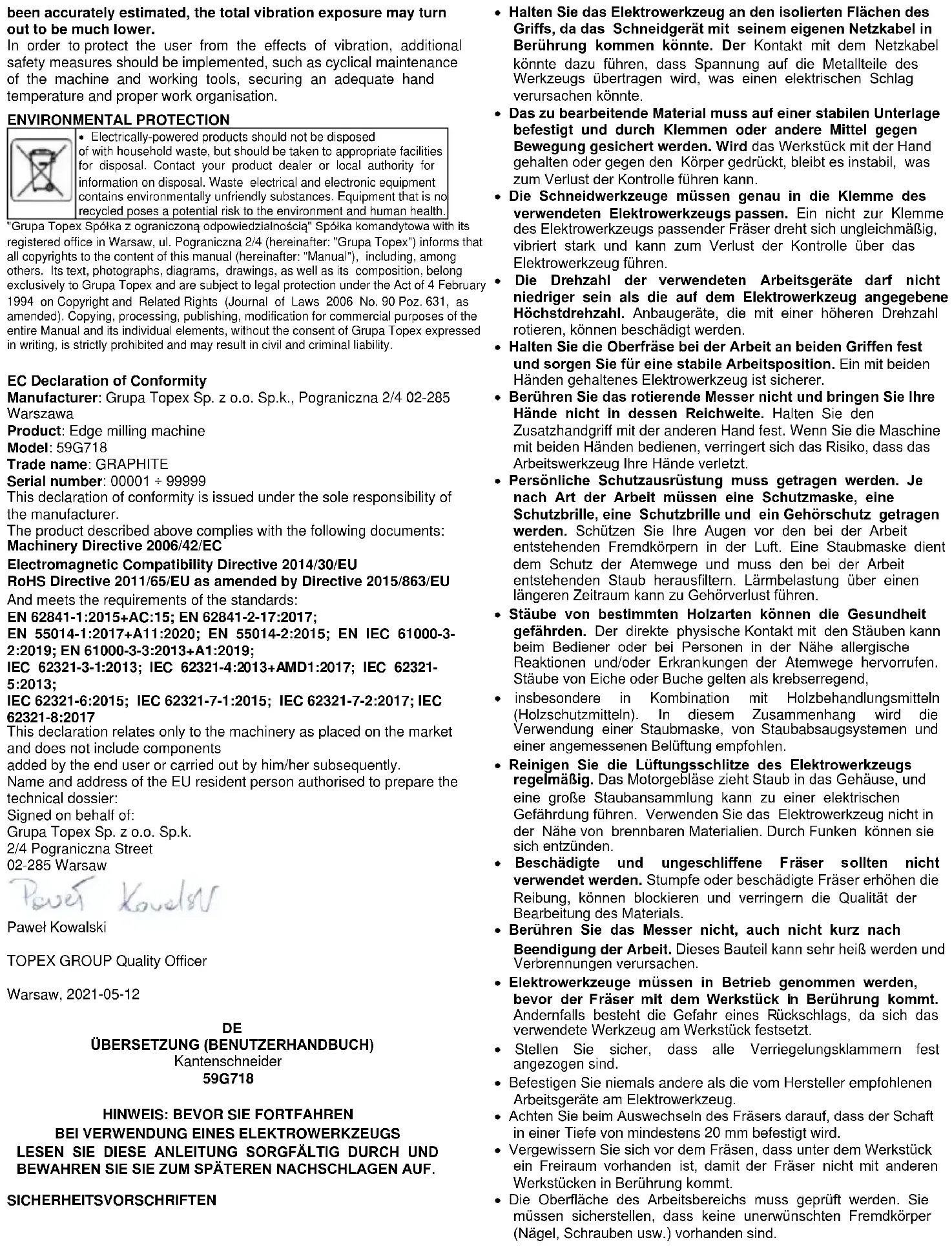 - Elektrisch betriebene Produkte dürfen nicht mit dem Hausmüll entsorgt werden, sondern müssen einer geeigneten Einrichtung zur Entsorgung zugeführt werden. Wenden Sie sich an Ihren Händler oder die örtlichen Behörden, um Informationen zur Entsorgung zu erhalten. Elektro- und Elektronik-Altgeräte enthalten umweltschädliche Stoffe. Geräte, die nicht recycelt werden, stellen eine potenzielle Gefahr für die Umwelt und die menschliche Gesundheit dar. "Grupa Topex Spółka z ograniczoną odpowiedzialnością". Spółka komandytowa mit Sitz in Warschau, ul. Pograniczna 2/4 (im Folgenden: "Grupa Topex") teilt mit, dass alle Urheberrechte am Inhalt dieses Handbuchs (im Folgenden: "Handbuch"), einschließlich, unter anderem. Der Text, die Fotografien, die Diagramme, die Zeichnungen sowie die Zusammensetzung des Handbuchs gehören ausschließlich der Grupa Topex und unterliegen dem rechtlichen Schutz gemäß dem Gesetz vom 4. Februar 1994 über dasUrheberrecht und verwandte Rechte (Gesetzblatt 2006 Nr. 90 Poz. 631, in der geänderten Fassung). Das Kopieren, Verarbeiten, Veröffentlichen und Verändern des gesamten Handbuchs und seiner einzelnen Elemente zu kommerziellen Zwecken ist ohne die schriftliche Zustimmung von Grupa Topex strengstens untersagt und kann zivil- und strafrechtliche Konsequenzen nach sich ziehen. EG-Konformitätserklärung Hersteller: Grupa Topex Sp. z o.o. Sp.k., Pograniczna 2/4 02-285 Warszawa Produkt: Kantenfräsmaschine Modell: 59G718 Handelsname: GRAPHITE Seriennummer: 00001 ÷ 99999 Diese Konformitätserklärung wird unter der alleinigen Verantwortung des Herstellers ausgestellt. Das oben beschriebene Produkt entspricht den folgenden Dokumenten: Maschinenrichtlinie 2006/42/EG Richtlinie 2014/30/EU über die elektromagnetische Verträglichkeit RoHS-Richtlinie 2011/65/EU, geändert durch Richtlinie 2015/863/EU Und erfüllt die Anforderungen der Normen: EN 62841-1:2015+AC:15; EN 62841-2-17:2017; EN 55014-1:2017+A11:2020; EN 55014-2:2015; EN IEC 61000-3- 2:2019; EN 61000-3-3:2013+A1:2019; IEC 62321-3-1:2013; IEC 62321-4:2013+AMD1:2017; IEC 62321- 5:2013; IEC 62321-6:2015; IEC 62321-7-1:2015; IEC 62321-7-2:2017; IEC 62321-8:2017 Diese Erklärung bezieht sich nur auf die Maschine in der Form, in der sie in Verkehr gebracht wird, und umfasst nicht die Bauteile vom Endnutzer hinzugefügt oder von ihm nachträglich durchgeführt werden. Name und Anschrift der in der EU ansässigen Person, die zur Erstellung des technischen Dossiers befugt ist: Unterzeichnet im Namen von: Grupa Topex Sp. z o.o. Sp.k. 2/4 Pograniczna Straße 02-285 Warschau Paweł Kowalski TOPEX GROUP Qualitätsbeauftragter Warschau, 2021-05-12