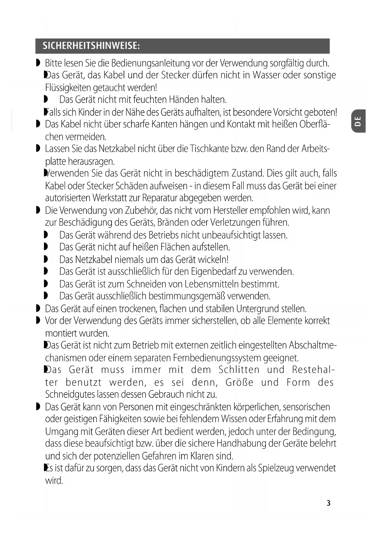 Das Gerät muss immer mit dem Schlitten und Restehal- ter benutzt werden, es sei denn, Größe und Form des Schneidgutes lassen dessen Gebrauch nicht zu. Das Gerät kann von Personen mit eingeschränkten körperlichen, sensorischen oder geistigen Fähigkeiten sowie bei fehlendem Wissen oder Erfahrung mit dem Umgang mit Geräten dieser Art bedient werden, jedoch unter der Bedingung, dass diese beaufsichtigt bzw. über die sichere Handhabung der Geräte belehrt und sich der potenziellen Gefahren im Klaren sind.
