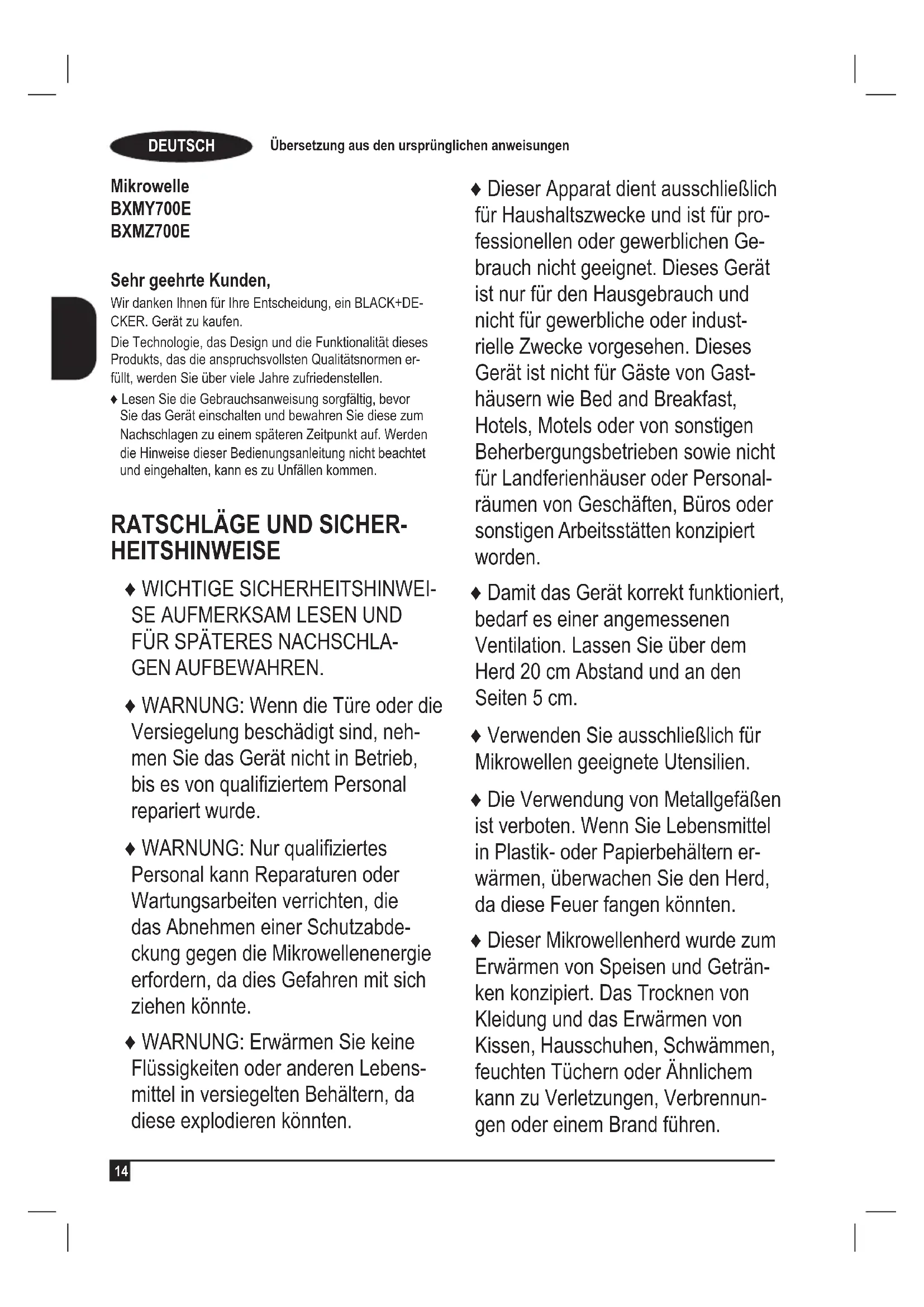 Mikrowelle BXMY700E BXMZ700E Sehr geehrte Kunden, Wir danken Ihnen für Ihre Entscheidung, ein BLACK+DE- CKER. Gerät zu kaufen. Die Technologie, das Design und die Funktionalität dieses Produkts, das die anspruchsvollsten Qualitätsnormen er- füllt, werden Sie über viele Jahre zufriedenstellen. ♦ Lesen Sie die Gebrauchsanweisung sorgfältig, bevor Sie das Gerät einschalten und bewahren Sie diese zum Nachschlagen zu einem späteren Zeitpunkt auf. Werden die Hinweise dieser Bedienungsanleitung nicht beachtet und eingehalten, kann es zu Unfällen kommen.