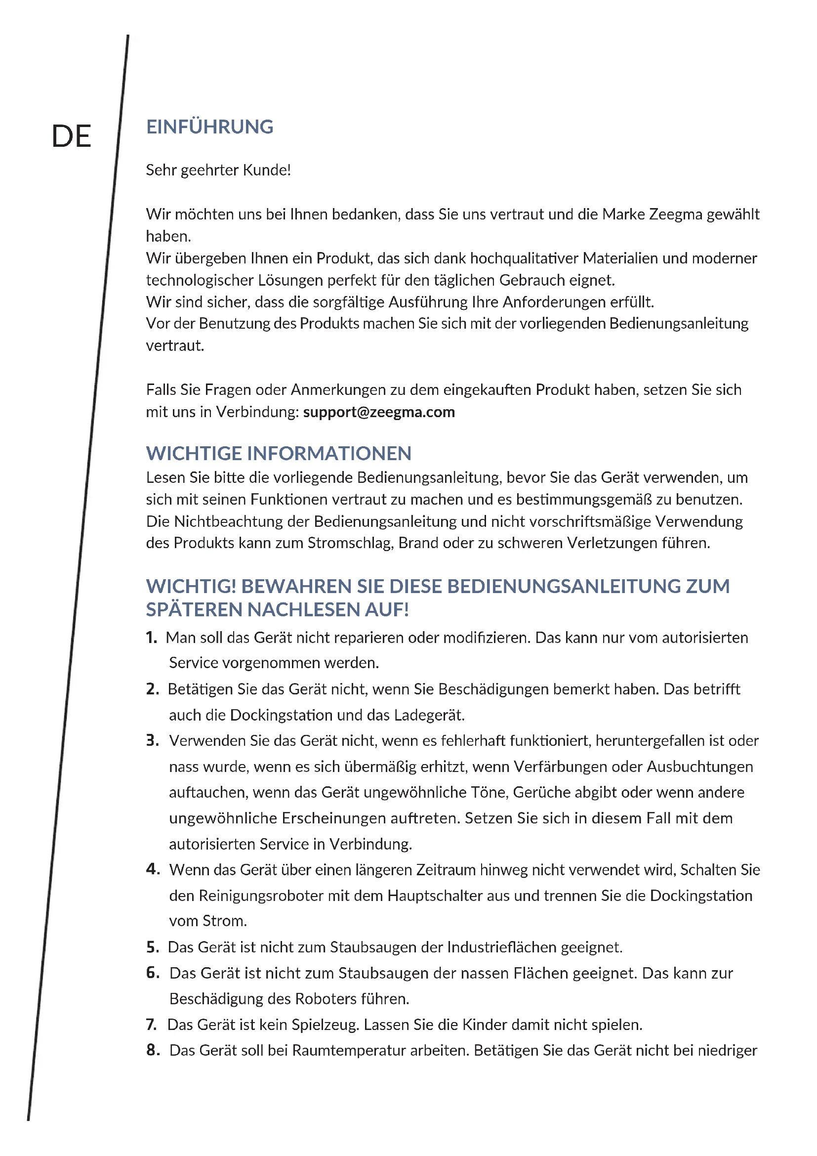 The pictures are for reference only. The real design of the products may dier from the pictures presented.DE EINFÜHRUNG Sehr geehrter Kunde! Wir möchten uns bei Ihnen bedanken, dass Sie uns vertraut und die Marke Zeegma gewählt haben. Wir übergeben Ihnen ein Produkt, das sich dank hochqualitaver Materialien und moderner technologischer Lösungen perfekt für den täglichen Gebrauch eignet. Wir sind sicher, dass die sorgfälge Ausführung Ihre Anforderungen erfüllt. Vor der Benutzung des Produkts machen Sie sich mit der vorliegenden Bedienungsanleitung vertraut. Falls Sie Fragen oder Anmerkungen zu dem eingekauen Produkt haben, setzen Sie sich mit uns in Verbindung: support@zeegma.com WICHTIGE INFORMATIONEN Lesen Sie bie die vorliegende Bedienungsanleitung, bevor Sie das Gerät verwenden, um sich mit seinen Funkonen vertraut zu machen und es besmmungsgemäß zu benutzen. Die Nichtbeachtung der Bedienungsanleitung und nicht vorschrismäßige Verwendung des Produkts kann zum Stromschlag, Brand oder zu schweren Verletzungen führen.