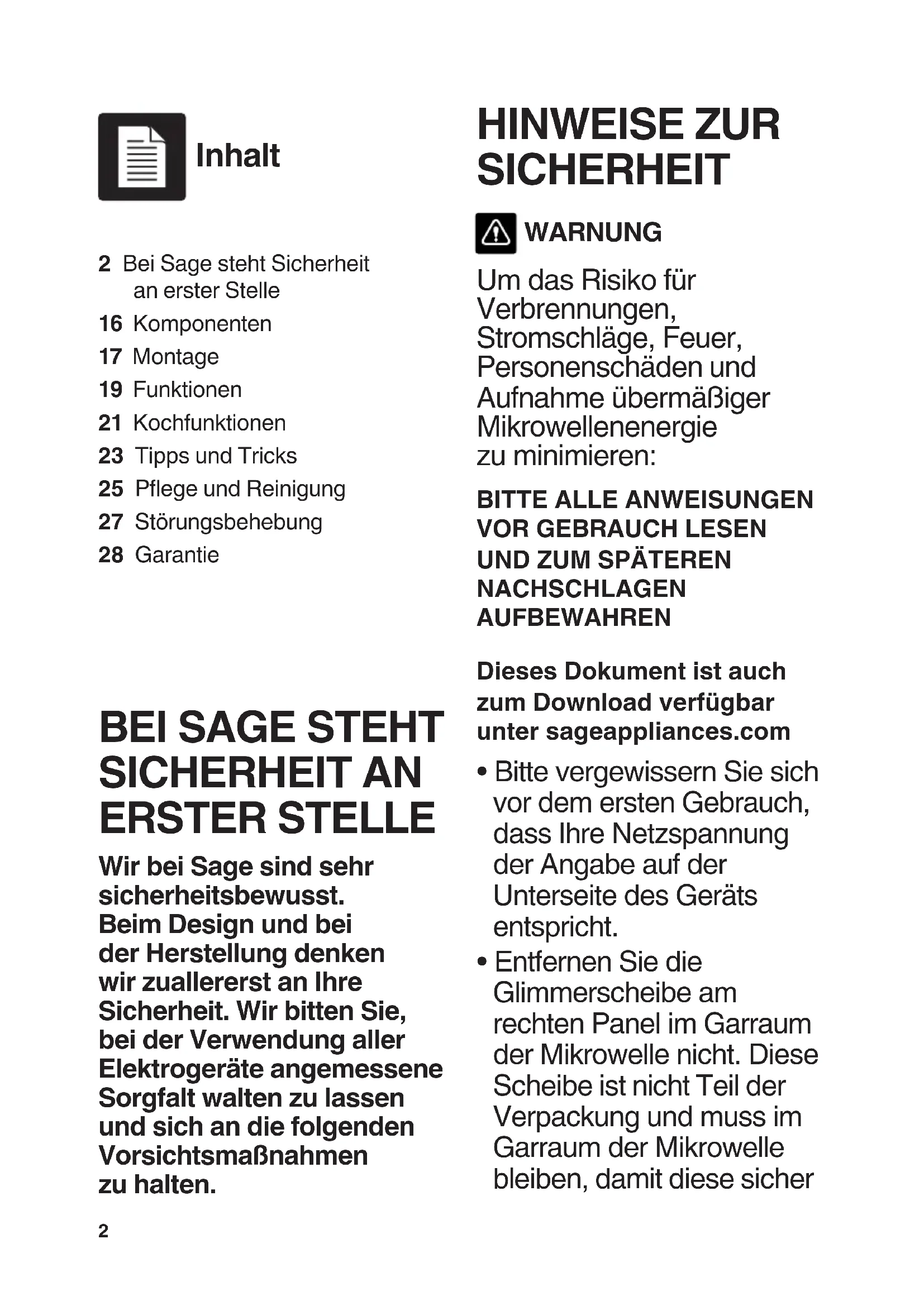 SICHERHEIT AN ERSTER STELLE Wir bei Sage sind sehr sicherheitsbewusst. Beim Design und bei der Herstellung denken wir zuallererst an Ihre Sicherheit. Wir bitten Sie, bei der Verwendung aller Elektrogeräte angemessene Sorgfalt walten zu lassen und sich an die folgenden Vorsichtsmaßnahmen zu halten. HINWEISE ZUR SICHERHEIT WARNUNG Um das Risiko für Verbrennungen, Stromschläge, Feuer, Personenschäden und Aufnahme übermäßiger Mikrowellenenergie zu minimieren: BITTE ALLE ANWEISUNGEN VOR GEBRAUCH LESEN UND ZUM SPÄTEREN NACHSCHLAGEN AUFBEWAHRENDieses Dokument ist auch zum Download verfügbar unter sageappliances.com
