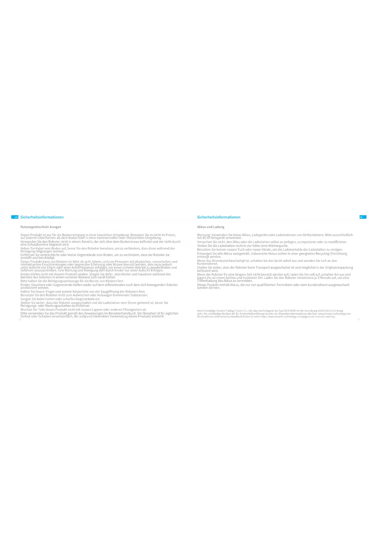 Akkus und Ladung Sicherheitsinformationen Warnung: Verwenden Sie keine Akkus, Ladegeräte oder Ladestationen von Drittanbietern. Bitte ausschließlich mit RCS0 Netzgerät verwenden. Versuchen Sie nicht, den Akku oder die Ladestation selbst zu zerlegen, zu reparieren oder zu modifizieren. Stellen Sie die Ladestation nicht in der Nähe einer Wärmequelle. Benutzen Sie keinen nassen Tuch oder nasse Hände, um die Ladekontakte der Ladestation zu reinigen. Entsorgen Sie alte Akkus sachgemäß. Unbenutzte Akkus sollten in einer geeigneten Recycling-Einrichtung entsorgt werden. Wenn das Stromkabel beschädigt ist, schalten Sie das Gerät sofort aus und wenden Sie sich an den Kundendienst. Stellen Sie sicher, dass der Roboter beim Transport ausgeschaltet ist und möglichst in der Originalverpackung befördert wird. Wenn der Roboter für eine längere Zeit nicht benutzt werden soll, laden Sie ihn voll auf, schalten ihn aus und lagern ihn an einem kühlen und trockenen Ort. Laden Sie den Roboter mindestens je 3 Monate auf, um eine Tiefentladung des Akkus zu vermeiden. Dieses Produkt enthält Akkus, die nur von qualifizierten Technikern oder dem Kundendienst ausgewechselt werden können. Hiermit bestätigt, Dreame Trading (Tianjin) Co., Ltd. dass das Funkgerät des Typs RLS5-WH0 mit der Verordnung 2014/53/EU in Einklang steht. Der vollständige Wortlaut der EU-Konformitätserklärung ist unter der folgenden Internetadresse abrufbar: www.dreame-technology.com Ein detailliertes elektronisches Handbuch finden Sie unter https://www.dreame-technology.com/pages/user-manuals-and-faqs Nutzungseinschrän-kungen Sicherheitsinformationen Dieses Produkt ist nur für die Bodenreinigung in einer häuslichen Umgebung. Benutzen Sie es nicht im Freien, auf anderen Oberflächen als dem Boden oder in einer kommerziellen oder industriellen Umgebung. Verwenden Sie den Roboter nicht in einem Bereich, der sich über dem Bodenniveau befindet und der nicht durch eine Schutzbarriere begrenzt wird. Heben Sie Kabel vom Boden auf, bevor Sie den Roboter benutzen, um zu verhindern, dass diese während der Reinigung mitgezogen werden. Entfernen Sie zerbrechliche oder kleine Gegenstände vom Boden, um zu verhindern, dass der Roboter sie anstößt und beschädigt. Dieses Produkt kann von Kindern im Alter ab acht Jahren, und von Personen mit physischen, sensorischen und intellektuellen Einschränkungen oder begrenzter Erfahrung oder Wissen benutzt werden, dies muss jedoch unter Aufsicht von Eltern oder einer Aufsichtsperson erfolgen, um einen sicheren Betrieb zu gewährleisten und Gefahren auszuschließen. Eine Wartung und Reinigung darf durch Kinder nur unter Aufsicht erfolgen. Kinder dürfen nicht mit diesem Produkt spielen. Sorgen Sie dafür, dass Kinder und Haustiere während des Betriebs des Roboters in einem sicheren Abstand zum Gerät halten. Bitte halten Sie die Reinigungswerkzeuge für die Bürste von Kindern fern. Kinder, Haustiere oder Gegenstände dürfen weder auf dem stillstehenden noch dem sich bewegenden Roboter positioniert werden. Halten Sie Haare, Finger und andere Körperteile von der Saugöffnung des Roboters fern. Benutzen Sie den Roboter nicht zum Aufwischen oder Aufsaugen brennender Substanzen. Saugen Sie keine harten oder scharfen Gegenstände ein. Stellen Sie sicher, dass der Roboter ausgeschaltet und die Ladestation vom Strom getrennt ist, bevor Sie Reinigungs- oder Wartungsarbeiten durchführen. Wischen Sie Teile dieses Produkt nicht mit nassen Lappen oder anderen Flüssigkeiten ab. Bitte verwenden Sie das Produkt gemäß den Anweisungen im Benutzerhandbuch. Der Benutzer ist für jeglichen Verlust oder Schaden verantwortlich, der aufgrund inkorrekter Verwendung dieses Produkts entsteht.22