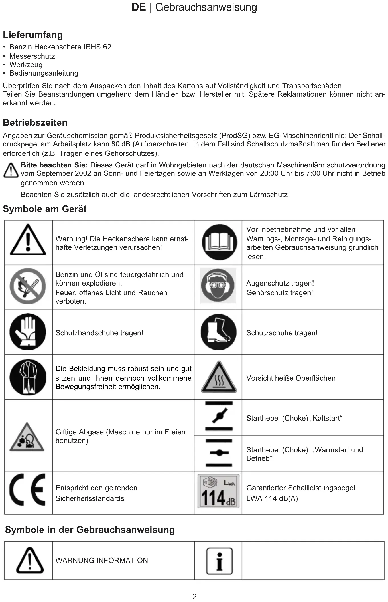 - Bedienungsanleitung Überprüfen Sie nach dem Auspacken den Inhalt des Kartons auf Vollständigkeit und Transportschäden Teilen Sie Beanstandungen umgehend dem Händler, bzw. Hersteller mit. Spätere Reklamationen können nicht an- erkannt werden. Betriebszeiten Angaben zur Geräuschemission gemäß Produktsicherheitsgesetz (ProdSG) bzw. EG-Maschinenrichtlinie: Der Schall- druckpegel am Arbeitsplatz kann 80 dB (A) überschreiten. In dem Fall sind Schallschutzmaßnahmen für den Bediener erforderlich (z.B. Tragen eines Gehörschutzes). Bitte beachten Sie: Dieses Gerät darf in Wohngebieten nach der deutschen Maschinenlärmschutzverordnung vom September 2002 an Sonn- und Feiertagen sowie an Werktagen von 20:00 Uhr bis 7:00 Uhr nicht in Betrieb genommen werden. Beachten Sie zusätzlich auch die landesrechtlichen Vorschriften zum Lärmschutz! Warnung! Die Heckenschere kann ernst- hafte Verletzungen verursachen! Vor Inbetriebnahme und vor allen Wartungs-, Montage- und Reinigungs- arbeiten Gebrauchsanweisung gründlich lesen. Benzin und Öl sind feuergefährlich und können explodieren. Feuer, offenes Licht und Rauchen verboten. Augenschutz tragen! Gehörschutz tragen! Schutzhandschuhe tragen! Schutzschuhe tragen! Die Bekleidung muss robust sein und gut sitzen und Ihnen dennoch vollkommene Bewegungsfreiheit ermöglichen. Vorsicht heiße Oberächen Giftige Abgase (Maschine nur im Freien benutzen) Starthebel (Choke) „Kaltstart“ Starthebel (Choke) „Warmstart und Betrieb“ Entspricht den geltenden Sicherheitsstandards Garantierter Schallleistungspegel LWA 114 dB(A) Symbole am GerätDE | Gebrauchsanweisung