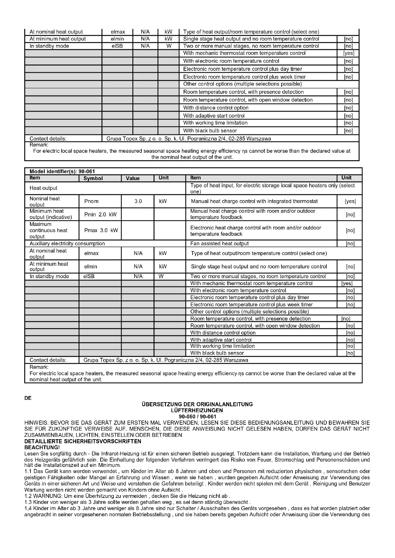 Mit schwarzem Lampensensor [Nein] Kontaktdetails : Grupa Topex Sp. Z oo z oo Sp. z oo k. Ul. Pograniczna 2/4, 02-285 Warszawa Anmerkung: Bei elektrischen lokalen Raumheizgeräten kann die gemessene saisonale Energieeffizienz ηs der Raumheizung nicht schlechter sein als der angegebene Wert bei der Nennwärmeleistung des Geräts.