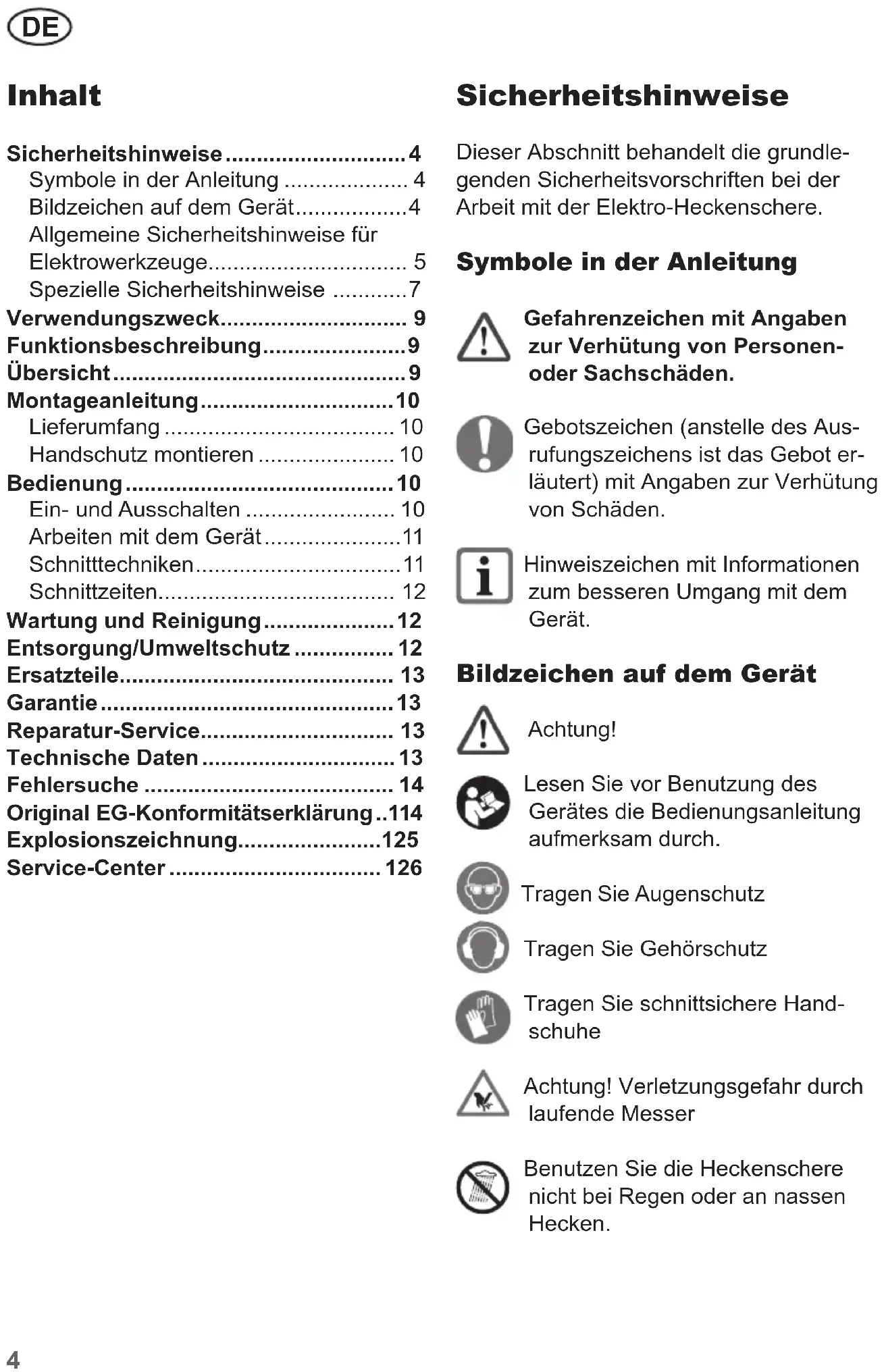 - Sicherheitshinweise Dieser Abschnitt behandelt die grundle- genden Sicherheitsvorschriften bei der Arbeit mit der Elektro-Heckenschere. Symbole in der Anleitung Gefahrenzeichen mit Angaben zur Verhütung von Personen- oder Sachschäden. Gebotszeichen (anstelle des Aus- rufungszeichens ist das Gebot er- läutert) mit Angaben zur Verhütung von Schäden. Hinweiszeichen mit Informationen zum besseren Umgang mit dem Gerät. Bildzeichen auf dem Gerät Achtung! Lesen Sie vor Benutzung des Gerätes die Bedienungsanleitung aufmerksam durch. Tragen Sie Augenschutz Tragen Sie Gehörschutz Tragen Sie schnittsichere Hand- schuhe Achtung! Verletzungsgefahr durch laufende Messer Benutzen Sie die Heckenschere nicht bei Regen oder an nassen Hecken. Inhalt Sicherheitshinweise p. 4