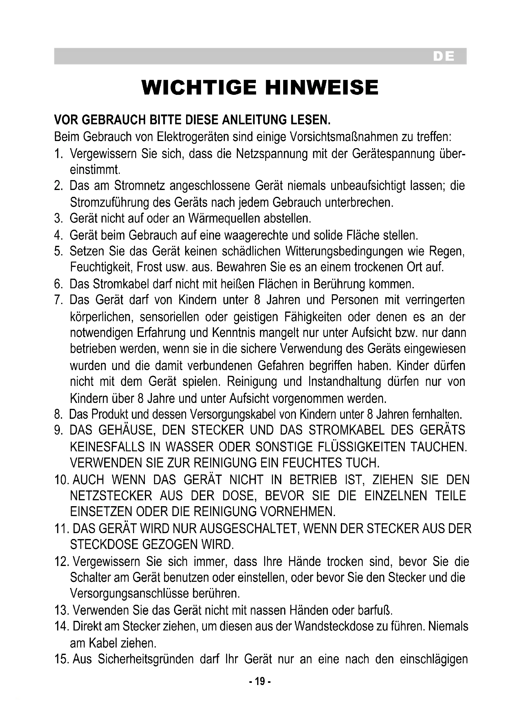 WICHTIGE HINWEISE VOR GEBRAUCH BITTE DIESE ANLEITUNG LESEN. Beim Gebrauch von Elektrogeräten sind einige Vorsichtsmaßnahmen zu treffen: