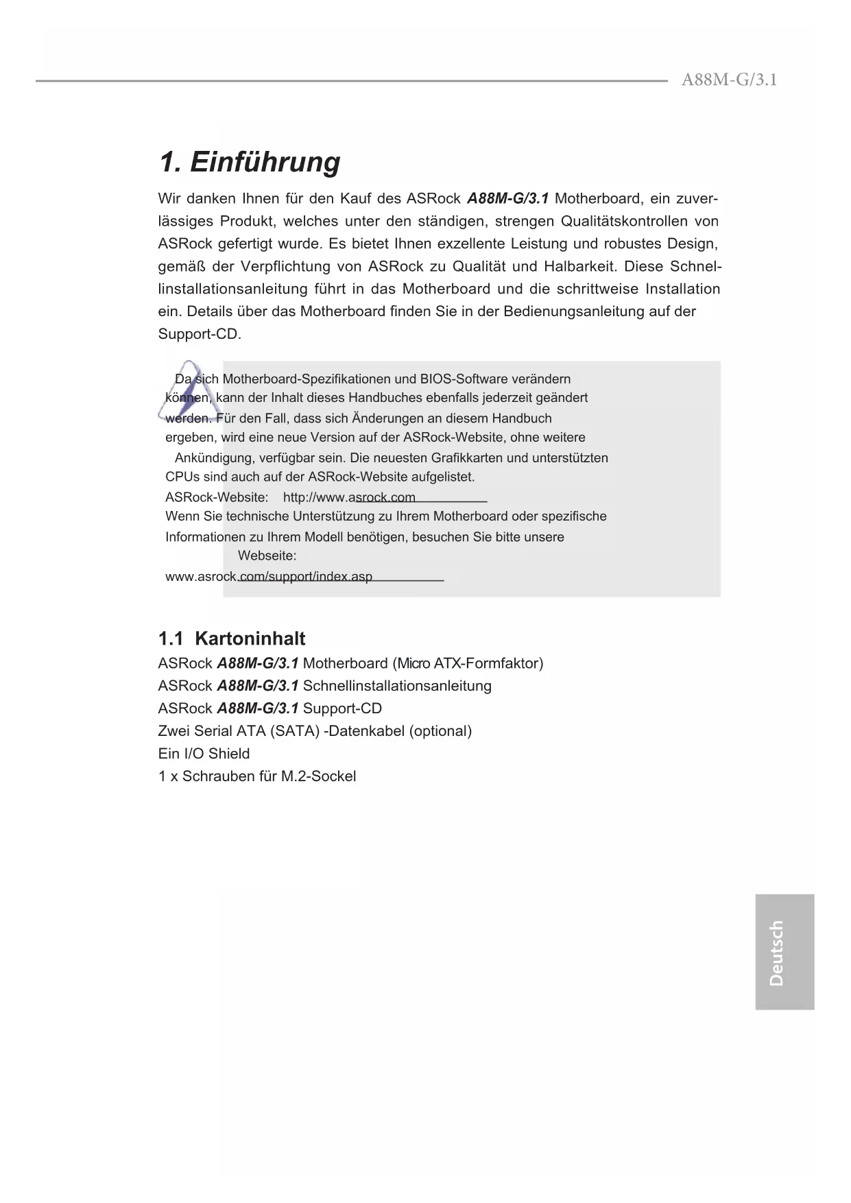 Wir danken Ihnen für den Kauf des ASRock A88M-G/3.1 Motherboard, ein zuver- lässiges Produkt, welches unter den ständigen, strengen Qualitätskontrollen von ASRock gefertigt wurde. Es bietet Ihnen exzellente Leistung und robustes Design, gemäß der Verpflichtung von ASRock zu Qualität und Halbarkeit. Diese Schnel- linstallationsanleitung führt in das Motherboard und die schrittweise Installation ein.DetailsüberdasMotherboardndenSieinderBedienungsanleitungaufder Support-CD. DasichMotherboard-SpezikationenundBIOS-Softwareverändern können, kann der Inhalt dieses Handbuches ebenfalls jederzeit geändert werden. Für den Fall, dass sich Änderungen an diesem Handbuch ergeben, wird eine neue Version auf der ASRock-Website, ohne weitere Ankündigung,verfügbarsein.DieneuestenGrakkartenundunterstützten CPUs sind auch auf der ASRock-Website aufgelistet. ASRock-Website: http://www.asrock.com WennSietechnischeUnterstützungzuIhremMotherboardoderspezische Informationen zu Ihrem Modell benötigen, besuchen Sie bitte unsere Webseite: www.asrock.com/support/index.asp