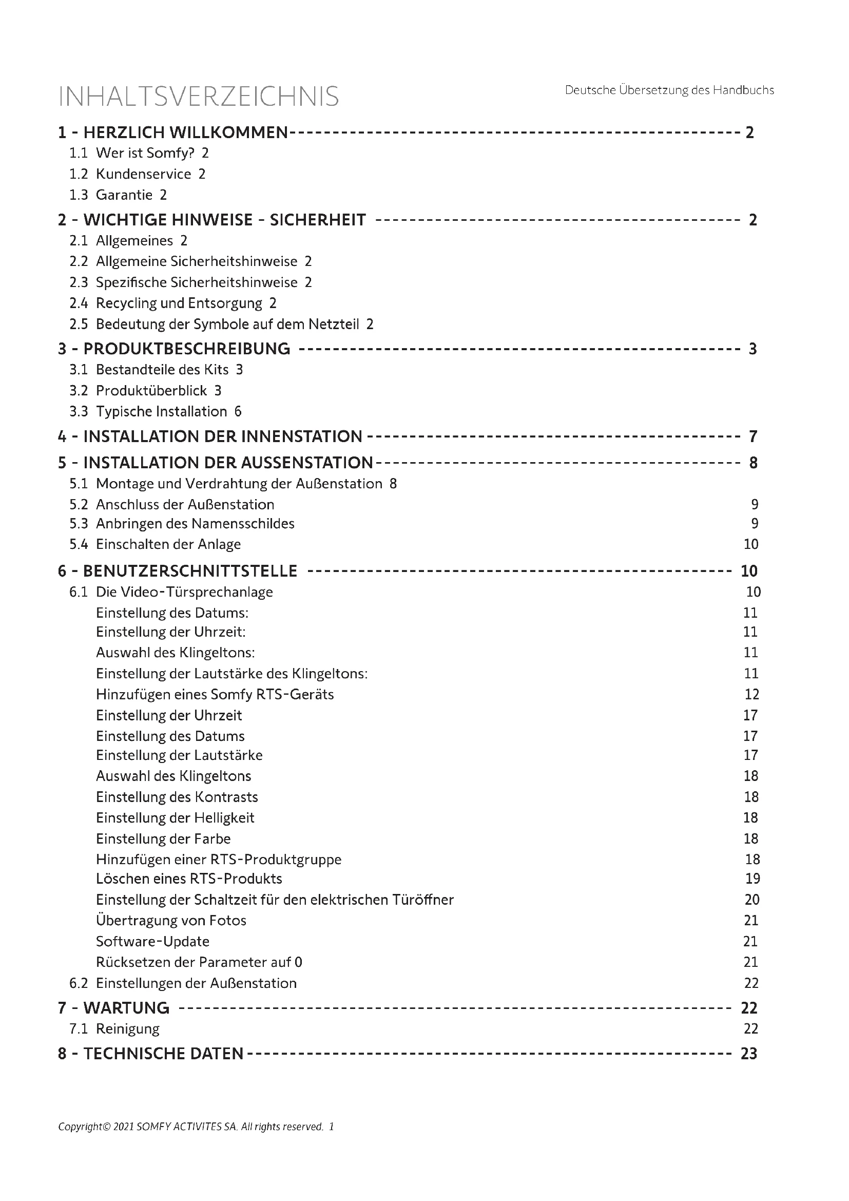 6.1 Die Video-Türsprechanlage 10 Einstellung des Datums: 11 Einstellung der Uhrzeit: 11 Auswahl des Klingeltons: 11 Einstellung der Lautstärke des Klingeltons: 11 Hinzufügen eines Somfy RTS-Geräts 12 Einstellung der Uhrzeit 17 Einstellung des Datums 17 Einstellung der Lautstärke 17 Auswahl des Klingeltons 18 Einstellung des Kontrasts 18 Einstellung der Helligkeit 18 Einstellung der Farbe 18 Hinzufügen einer RTS-Produktgruppe 18 Löschen eines RTS-Produkts 19 Einstellung der Schaltzeit für den elektrischen Türöner 20 Übertragung von Fotos 21 Software-Update 21 Rücksetzen der Parameter auf 0 21 6.2 Einstellungen der Außenstation 22