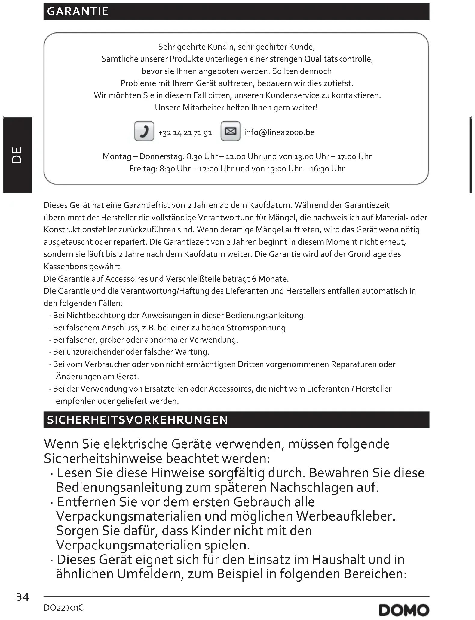 GARANTIE Sehr geehrte Kundin, sehr geehrter Kunde, Sämtliche unserer Produkte unterliegen einer strengen Qualitätskontrolle, bevor sie Ihnen angeboten werden. Sollten dennoch Probleme mit Ihrem Gerät auftreten, bedauern wir dies zutiefst. Wir möchten Sie in diesem Fall bitten, unseren Kundenservice zu kontaktieren. Unsere Mitarbeiter helfen Ihnen gern weiter! +32 14 21 71 91 info@linea2000.be Montag – Donnerstag: 8:30 Uhr – 12:00 Uhr und von 13:00 Uhr – 17:00 Uhr Freitag: 8:30 Uhr – 12:00 Uhr und von 13:00 Uhr – 16:30 Uhr Dieses Gerät hat eine Garantiefrist von 2 Jahren ab dem Kaufdatum. Während der Garantiezeit übernimmt der Hersteller die vollständige Verantwortung für Mängel, die nachweislich auf Material- oder Konstruktionsfehler zurückzuführen sind. Wenn derartige Mängel auftreten, wird das Gerät wenn nötig ausgetauscht oder repariert. Die Garantiezeit von 2 Jahren beginnt in diesem Moment nicht erneut, sondern sie läuft bis 2 Jahre nach dem Kaufdatum weiter. Die Garantie wird auf der Grundlage des Kassenbons gewährt. Die Garantie auf Accessoires und Verschleißteile beträgt 6 Monate. Die Garantie und die Verantwortung/Haftung des Lieferanten und Herstellers entfallen automatisch in den folgenden Fällen: