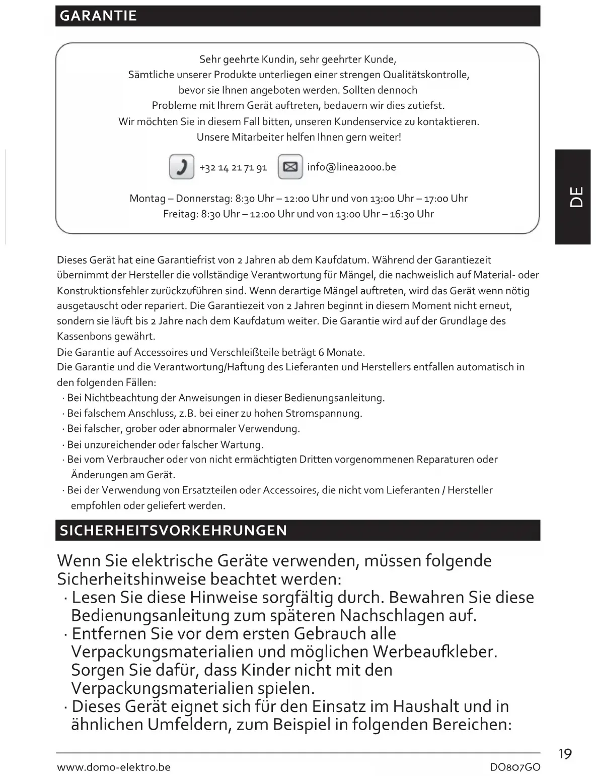GARANTIE Sehr geehrte Kundin, sehr geehrter Kunde, Sämtliche unserer Produkte unterliegen einer strengen Qualitätskontrolle, bevor sie Ihnen angeboten werden. Sollten dennoch Probleme mit Ihrem Gerät auftreten, bedauern wir dies zutiefst. Wir möchten Sie in diesem Fall bitten, unseren Kundenservice zu kontaktieren. Unsere Mitarbeiter helfen Ihnen gern weiter! +32 14 21 71 91 info@linea2000.be Montag – Donnerstag: 8:30 Uhr – 12:00 Uhr und von 13:00 Uhr – 17:00 Uhr Freitag: 8:30 Uhr – 12:00 Uhr und von 13:00 Uhr – 16:30 Uhr Dieses Gerät hat eine Garantiefrist von 2 Jahren ab dem Kaufdatum. Während der Garantiezeit übernimmt der Hersteller die vollständige Verantwortung für Mängel, die nachweislich auf Material- oder Konstruktionsfehler zurückzuführen sind. Wenn derartige Mängel auftreten, wird das Gerät wenn nötig ausgetauscht oder repariert. Die Garantiezeit von 2 Jahren beginnt in diesem Moment nicht erneut, sondern sie läuft bis 2 Jahre nach dem Kaufdatum weiter. Die Garantie wird auf der Grundlage des Kassenbons gewährt. Die Garantie auf Accessoires und Verschleißteile beträgt 6 Monate. Die Garantie und die Verantwortung/Haftung des Lieferanten und Herstellers entfallen automatisch in den folgenden Fällen: