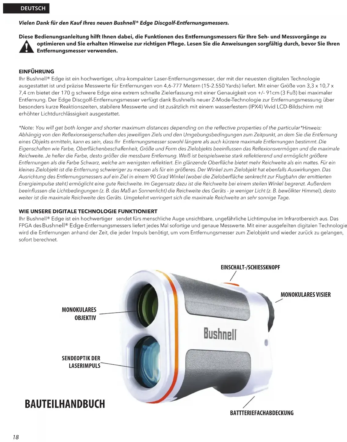 Ihr Bushnell® Edge ist ein hochwertiger sendet fürs menschliche Auge unsichtbare, ungefährliche Lichtimpulse im Infrarotbereich aus. Das FPGA des Bushnell® Edge -Entfernungsmessers liefert jedes Mal sofortige und genaue Messwerte. Mit einer ausgefeilten digitalen Technologie wird die Entfernungen anhand der Zeit, die jeder Impuls benötigt, um vom Entfernungsmesser zum Zielobjekt und wieder zurück zu gelangen, sofort berechnet. DEUTSCH SENDEOPTIK DER LASERIMPULS BAUTEILHANDBUCH EINSCHALT-/SCHIESSKNOPF MONOKULARES VISIER BATTTERIEFACHABDECKUNG MONOKULARES OBJEKTIV19