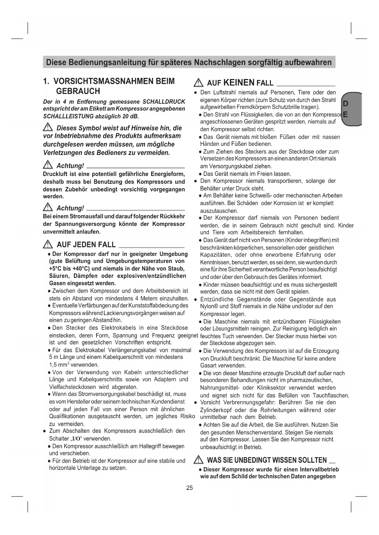 GEBRAUCH Der in 4 m Entfernung gemessene SCHALLDRUCK entspricht der am Etikett am Kompressor angegebenen SCHALLLEISTUNG abzüglich 20 dB. Dieses Symbol weist auf Hinweise hin, die vor Inbetriebnahme des Produkts aufmerksam durchgelesen werden müssen, um mögliche Verletzungen des Bedieners zu vermeiden. Achtung! Druckluft ist eine potentiell gefährliche Energieform, deshalb muss bei Benutzung des Kompressors und dessen Zubehör unbedingt vorsichtig vorgegangen werden. Achtung! Bei einem Stromausfall und darauf folgender Rückkehr der Spannungsversorgung könnte der Kompressor unvermittelt anlaufen.