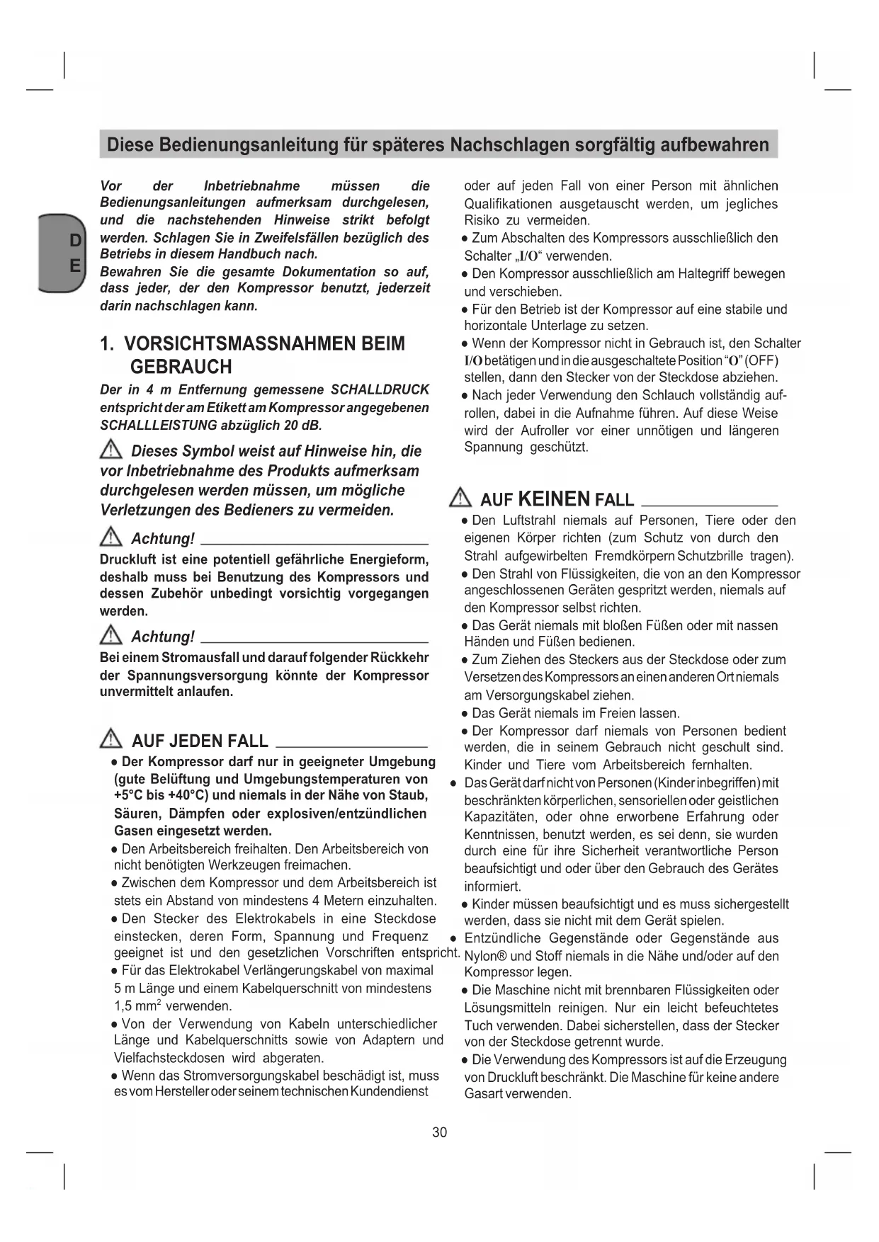 GEBRAUCH Der in 4 m Entfernung gemessene SCHALLDRUCK entspricht der am Etikett am Kompressor angegebenen SCHALLLEISTUNG abzüglich 20 dB. Dieses Symbol weist auf Hinweise hin, die vor Inbetriebnahme des Produkts aufmerksam durchgelesen werden müssen, um mögliche Verletzungen des Bedieners zu vermeiden. Achtung! Druckluft ist eine potentiell gefährliche Energieform, deshalb muss bei Benutzung des Kompressors und dessen Zubehör unbedingt vorsichtig vorgegangen werden. Achtung! Bei einem Stromausfall und darauf folgender Rückkehr der Spannungsversorgung könnte der Kompressor unvermittelt anlaufen.