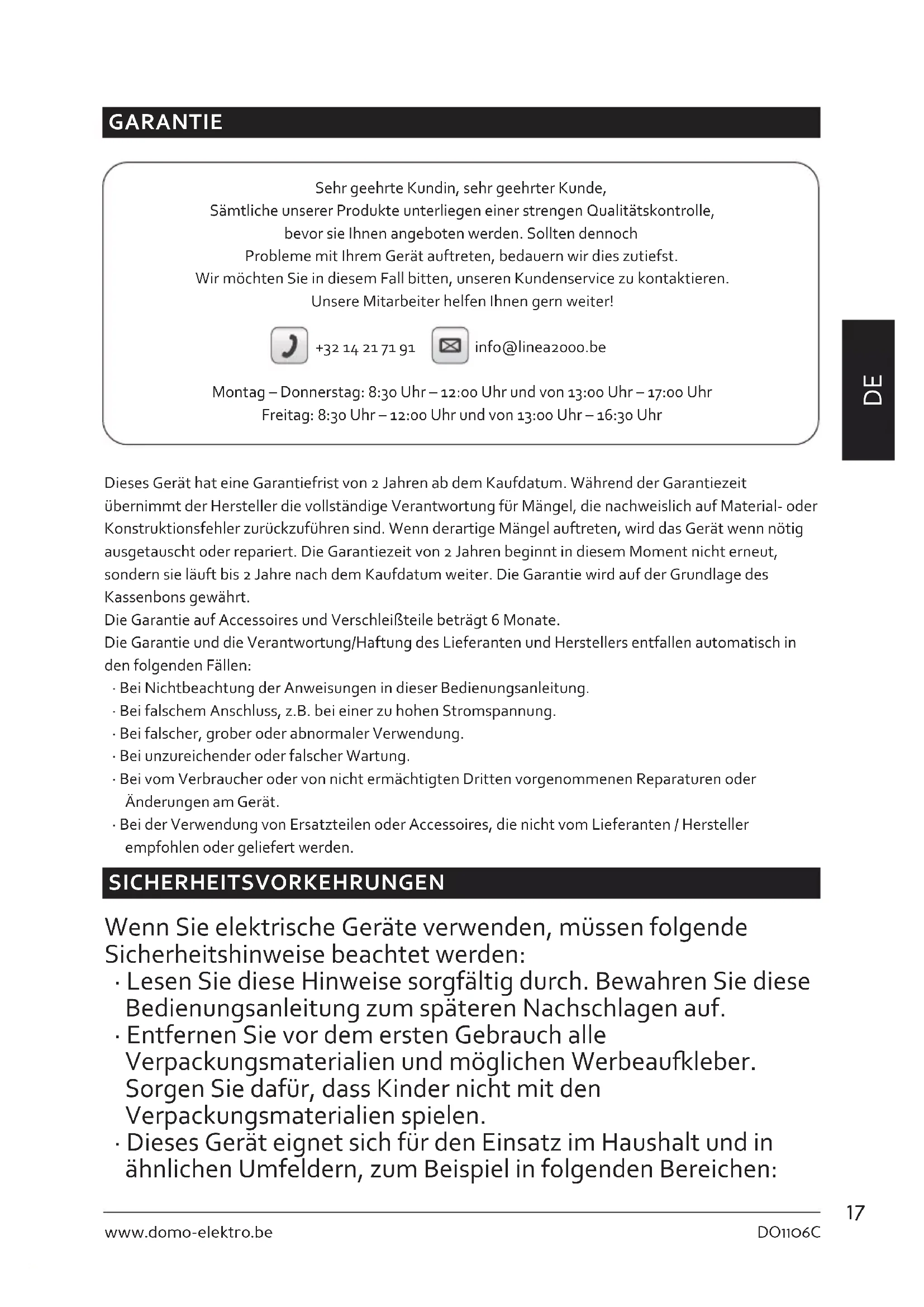 - Vor Gebrauch überprüfen, ob die auf dem Gerät angegebene Spannung mit der elektrischen Spannung des Stromnetzes Ihres Hauses übereinstimmt.19 DO1106C www.domo-elektro.be