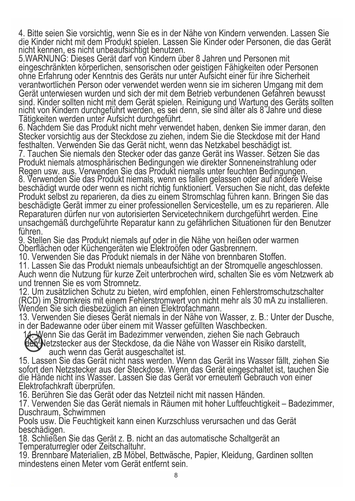 7. Tauchen Sie niemals den Stecker oder das ganze Gerät ins Wasser. Setzen Sie das