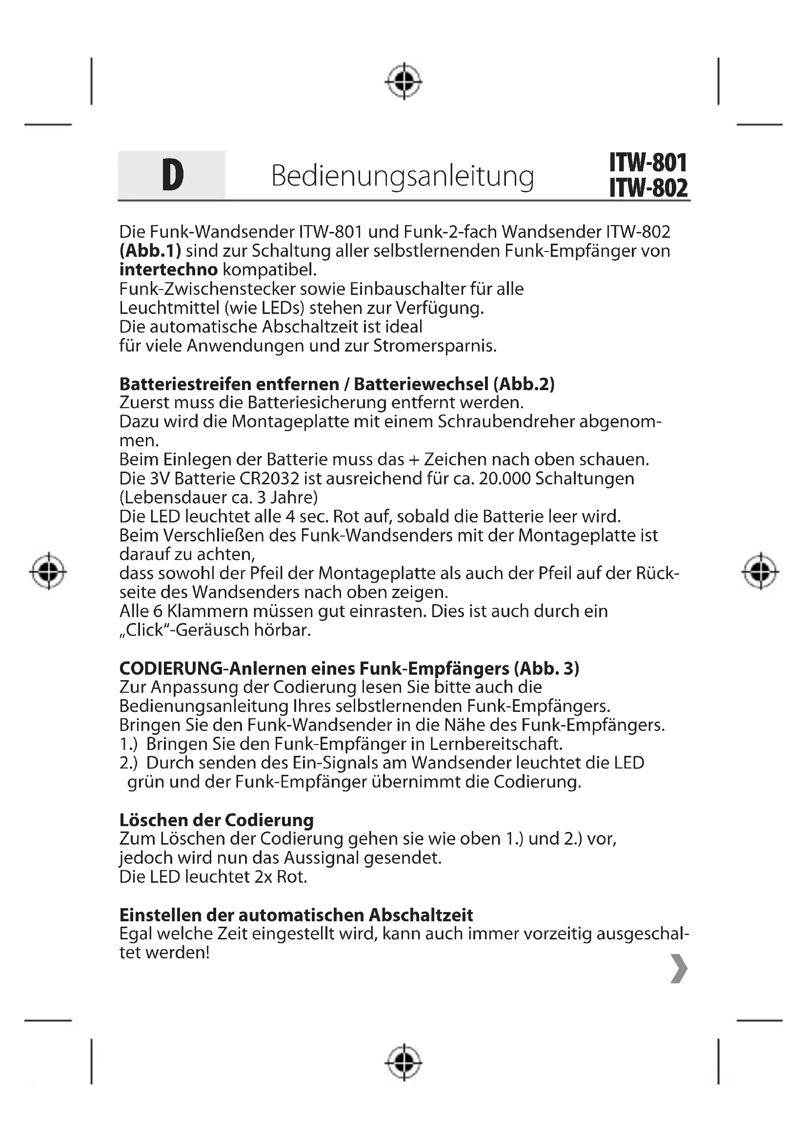 2.) 1.)Die Funk-Wandsender ITW-801 und Funk-2-fach Wandsender ITW-802 (Abb.1) sind zur Schaltung aller selbstlernenden Funk-Empfänger von intertechno kompatibel. Funk-Zwischenstecker sowie Einbauschalter für alle Leuchtmittel (wie LEDs) stehen zur Verfügung. Die automatische Abschaltzeit ist ideal für viele Anwendungen und zur Stromersparnis. Batteriestreifen entfernen / Batteriewechsel (Abb.2) Zuerst muss die Batteriesicherung entfernt werden. Dazu wird die Montageplatte mit einem Schraubendreher abgenom- men. Beim Einlegen der Batterie muss das + Zeichen nach oben schauen. Die 3V Batterie CR2032 ist ausreichend für ca. 20.000 Schaltungen (Lebensdauer ca. 3 Jahre) Die LED leuchtet alle 4 sec. Rot auf, sobald die Batterie leer wird. Beim Verschließen des Funk-Wandsenders mit der Montageplatte ist darauf zu achten, dass sowohl der Pfeil der Montageplatte als auch der Pfeil auf der Rück- seite des Wandsenders nach oben zeigen. Alle 6 Klammern müssen gut einrasten. Dies ist auch durch ein „Click“-Geräusch hörbar. CODIERUNG-Anlernen eines Funk-Empfängers (Abb. 3) Zur Anpassung der Codierung lesen Sie bitte auch die Bedienungsanleitung Ihres selbstlernenden Funk-Empfängers. Bringen Sie den Funk-Wandsender in die Nähe des Funk-Empfängers. 1.) Bringen Sie den Funk-Empfänger in Lernbereitschaft. 2.) Durch senden des Ein-Signals am Wandsender leuchtet die LED grün und der Funk-Empfänger übernimmt die Codierung. Löschen der Codierung Zum Löschen der Codierung gehen sie wie oben 1.) und 2.) vor, jedoch wird nun das Aussignal gesendet. Die LED leuchtet 2x Rot. Einstellen der automatischen Abschaltzeit Egal welche Zeit eingestellt wird, kann auch immer vorzeitig ausgeschal- tet werden! Bedienungsanleitung