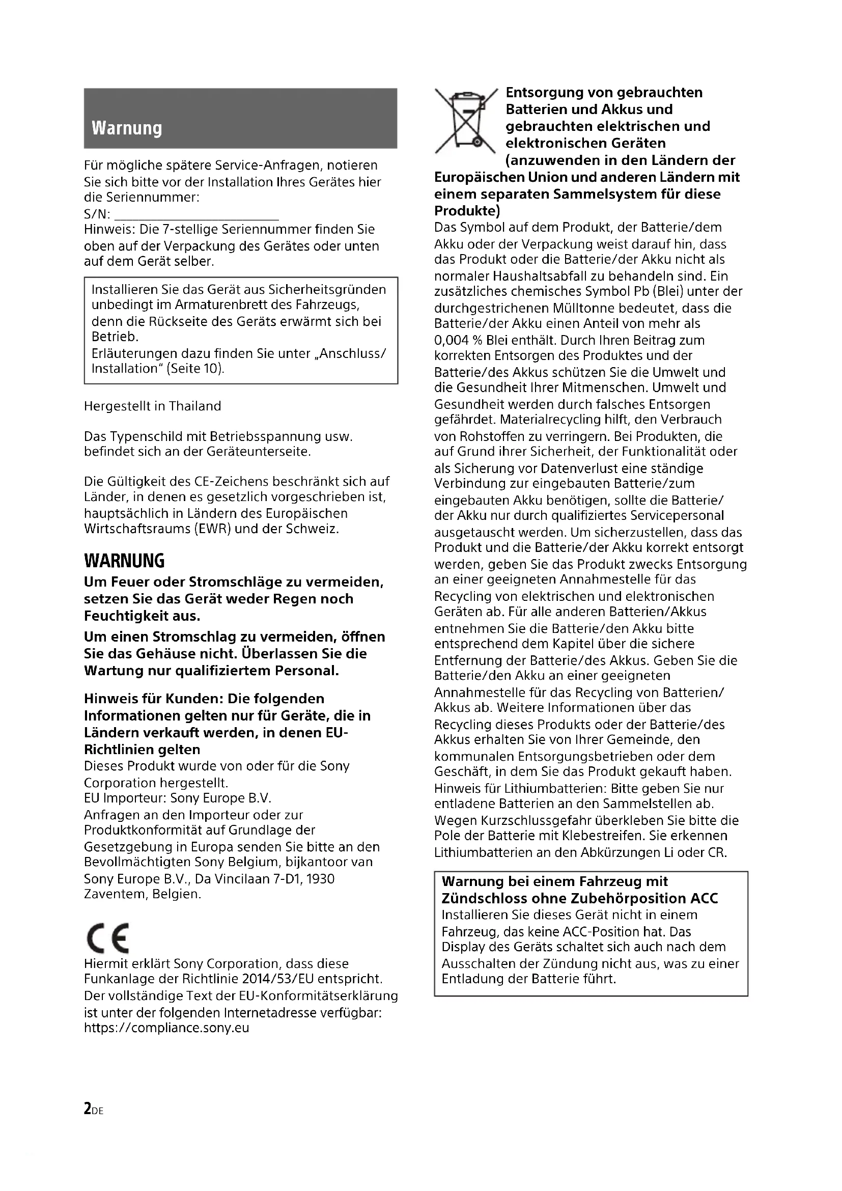 pondre aux demandes portant sur le contenu du code source.2DE Für mögliche spätere Service-Anfragen, notieren Sie sich bitte vor der Installation Ihres Gerätes hier die Seriennummer: S/N: ___________________________ Hinweis: Die 7-stellige Seriennummer finden Sie oben auf der Verpackung des Gerätes oder unten auf dem Gerät selber. Hergestellt in Thailand Das Typenschild mit Betriebsspannung usw. befindet sich an der Geräteunterseite. Die Gültigkeit des CE-Zeichens beschränkt sich auf Länder, in denen es gesetzlich vorgeschrieben ist, hauptsächlich in Ländern des Europäischen Wirtschaftsraums (EWR) und der Schweiz. WARNUNG Um Feuer oder Stromschläge zu vermeiden, setzen Sie das Gerät weder Regen noch Feuchtigkeit aus. Um einen Stromschlag zu vermeiden, öffnen Sie das Gehäuse nicht. Überlassen Sie die Wartung nur qualifiziertem Personal. Hinweis für Kunden: Die folgenden Informationen gelten nur für Geräte, die in Ländern verkauft werden, in denen EU- Richtlinien gelten Dieses Produkt wurde von oder für die Sony Corporation hergestellt. EU Importeur: Sony Europe B.V. Anfragen an den Importeur oder zur Produktkonformität auf Grundlage der Gesetzgebung in Europa senden Sie bitte an den Bevollmächtigten Sony Belgium, bijkantoor van Sony Europe B.V., Da Vincilaan 7-D1, 1930 Zaventem, Belgien. Hiermit erklärt Sony Corporation, dass diese Funkanlage der Richtlinie 2014/53/EU entspricht. Der vollständige Text der EU-Konformitätserklärung ist unter der folgenden Internetadresse verfügbar: https://compliance.sony.eu Entsorgung von gebrauchten Batterien und Akkus und gebrauchten elektrischen und elektronischen Geräten (anzuwenden in den Ländern der Europäischen Union und anderen Ländern mit einem separaten Sammelsystem für diese Produkte) Das Symbol auf dem Produkt, der Batterie/dem Akku oder der Verpackung weist darauf hin, dass das Produkt oder die Batterie/der Akku nicht als normaler Haushaltsabfall zu behandeln sind. Ein zusätzliches chemisches Symbol Pb (Blei) unter der durchgestrichenen Mülltonne bedeutet, dass die Batterie/der Akku einen Anteil von mehr als 0,004 % Blei enthält. Durch Ihren Beitrag zum korrekten Entsorgen des Produktes und der Batterie/des Akkus schützen Sie die Umwelt und die Gesundheit Ihrer Mitmenschen. Umwelt und Gesundheit werden durch falsches Entsorgen gefährdet. Materialrecycling hilft, den Verbrauch von Rohstoffen zu verringern. Bei Produkten, die auf Grund ihrer Sicherheit, der Funktionalität oder als Sicherung vor Datenverlust eine ständige Verbindung zur eingebauten Batterie/zum eingebauten Akku benötigen, sollte die Batterie/ der Akku nur durch qualifiziertes Servicepersonal ausgetauscht werden. Um sicherzustellen, dass das Produkt und die Batterie/der Akku korrekt entsorgt werden, geben Sie das Produkt zwecks Entsorgung an einer geeigneten Annahmestelle für das Recycling von elektrischen und elektronischen Geräten ab. Für alle anderen Batterien/Akkus entnehmen Sie die Batterie/den Akku bitte entsprechend dem Kapitel über die sichere Entfernung der Batterie/des Akkus. Geben Sie die Batterie/den Akku an einer geeigneten Annahmestelle für das Recycling von Batterien/ Akkus ab. Weitere Informationen über das Recycling dieses Produkts oder der Batterie/des Akkus erhalten Sie von Ihrer Gemeinde, den kommunalen Entsorgungsbetrieben oder dem Geschäft, in dem Sie das Produkt gekauft haben. Hinweis für Lithiumbatterien: Bitte geben Sie nur entladene Batterien an den Sammelstellen ab. Wegen Kurzschlussgefahr überkleben Sie bitte die Pole der Batterie mit Klebestreifen. Sie erkennen Lithiumbatterien an den Abkürzungen Li oder CR. Warnung Installieren Sie das Gerät aus Sicherheitsgründen unbedingt im Armaturenbrett des Fahrzeugs, denn die Rückseite des Geräts erwärmt sich bei Betrieb. Erläuterungen dazu finden Sie unter „Anschluss/ Installation“ (Seite 10). Warnung bei einem Fahrzeug mit Zündschloss ohne Zubehörposition ACC Installieren Sie dieses Gerät nicht in einem Fahrzeug, das keine ACC-Position hat. Das Display des Geräts schaltet sich auch nach dem Ausschalten der Zündung nicht aus, was zu einer Entladung der Batterie führt.3DE Haftungsausschluss für von Dritten angebotene Dienste Von Dritten angebotene Dienste können ohne vorherige Ankündigung geändert, ausgesetzt oder eingestellt werden. Sony übernimmt in diesen Fällen keine Haftung. Hinweis zu den Änderungen am Gerät Informationen zu den neuesten Funktionen finden Sie unter „Hilfe“ auf der Website. QR-Code und URL finden Sie auf der vorderen Umschlagseite. Vorsicht UNTER KEINEN UMSTÄNDEN ÜBERNIMMT SONY DIE HAFTUNG FÜR INDIREKTE, NEBEN-, FOLGE- ODER