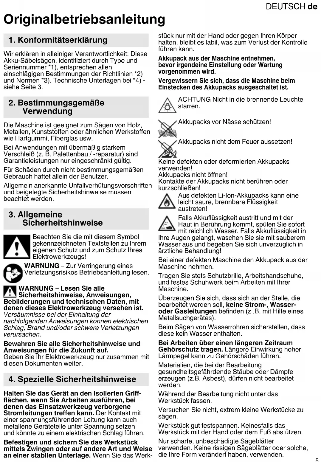 Originalbetriebsanleitung Wir erklären in alleiniger Verantwortlichkeit: Diese Akku-Säbelsägen, identifiziert durch Type und Seriennummer *1), entsprechen allen einschlägigen Bestimmungen der Richtlinien *2) und Normen *3). Technische Unterlagen bei *4) - siehe Seite 3. Die Maschine ist geeignet zum Sägen von Holz, Metallen, Kunststoffen oder ähnlichen Werkstoffen wie Hartgummi, Fiberglas usw. Bei Anwendungen mit übermäßig starkem Verschleiß (z. B. Palettenbau / -reparatur) sind Garantieleistungen nur eingeschränkt gültig. Für Schäden durch nicht bestimmungsgemäßen Gebrauch haftet allein der Benutzer. Allgemein anerkannte Unfallverhütungsvorschriften und beigelegte Sicherheitshinweise müssen beachtet werden. Beachten Sie die mit diesem Symbol gekennzeichneten Textstellen zu Ihrem eigenen Schutz und zum Schutz Ihres Elektrowerkzeugs! WARNUNG – Zur Verringerung eines Verletzungsrisikos Betriebsanleitung lesen. WARNUNG – Lesen Sie alle Sicherheitshinweise, Anweisungen, Bebilderungen und technischen Daten, mit denen dieses Elektrowerkzeug versehen ist. Versäumnisse bei der Einhaltung der nachfolgenden Anweisungen können elektrischen Schlag, Brand und/oder schwere Verletzungen verursachen. Bewahren Sie alle Sicherheitshinweise und Anweisungen für die Zukunft auf. Geben Sie Ihr Elektrowerkzeug nur zusammen mit diesen Dokumenten weiter. Halten Sie das Gerät an den isolierten Griff- flächen, wenn Sie Arbeiten ausführen, bei denen das Einsatzwerkzeug verborgene Stromleitungen treffen kann. Der Kontakt mit einer spannungsführenden Leitung kann auch metallene Geräteteile unter Spannung setzen und könnte zu einem elektrischen Schlag führen. Befestigen und sichern Sie das Werkstück mittels Zwingen oder auf andere Art und Weise an einer stabilen Unterlage. Wenn Sie das Werk- stück nur mit der Hand oder gegen Ihren Körper halten, bleibt es labil, was zum Verlust der Kontrolle führen kann. Akkupack aus der Maschine entnehmen, bevor irgendeine Einstellung oder Wartung vorgenommen wird. Vergewissern Sie sich, dass die Maschine beim Einstecken des Akkupacks ausgeschaltet ist. ACHTUNG Nicht in die brennende Leuchte starren. Akkupacks vor Nässe schützen! Akkupacks nicht dem Feuer aussetzen! Keine defekten oder deformierten Akkupacks verwenden! Akkupacks nicht öffnen! Kontakte der Akkupacks nicht berühren oder kurzschließen! Aus defekten Li-Ion-Akkupacks kann eine leicht saure, brennbare Flüssigkeit austreten! Falls Akkuflüssigkeit austritt und mit der Haut in Berührung kommt, spülen Sie sofort mit reichlich Wasser. Falls Akkuflüssigkeit in Ihre Augen gelangt, waschen Sie sie mit sauberem Wasser aus und begeben Sie sich unverzüglich in ärztliche Behandlung! Bei einer defekten Maschine den Akkupack aus der Maschine nehmen. Tragen Sie stets Schutzbrille, Arbeitshandschuhe, und festes Schuhwerk beim Arbeiten mit Ihrer Maschine. Überzeugen Sie sich, dass sich an der Stelle, die bearbeitet werden soll, keine Strom-, Wasser- oder Gasleitungen befinden (z .B. mit Hilfe eines Metallsuchgerätes). Beim Sägen von Wasserrohren sicherstellen, dass diese kein Wasser enthalten. Bei Arbeiten über einen längeren Zeitraum Gehörschutz tragen. Längere Einwirkung hoher Lärmpegel kann zu Gehörschäden führen. Materialien, die bei der Bearbeitung gesundheitsgefährdende Stäube oder Dämpfe erzeugen (z.B. Asbest), dürfen nicht bearbeitet werden. Während der Bearbeitung nicht unter das Werkstück fassen. Versuchen Sie nicht, extrem kleine Werkstücke zu sägen. Werkstück gut festspannen. Keinesfalls das Werkstück mit der Hand oder dem Fuß abstützen. Nur scharfe, unbeschädigte Sägeblätter verwenden. Keine rissigen Sägeblätter oder solche, die Ihre Form verändert haben, verwenden.