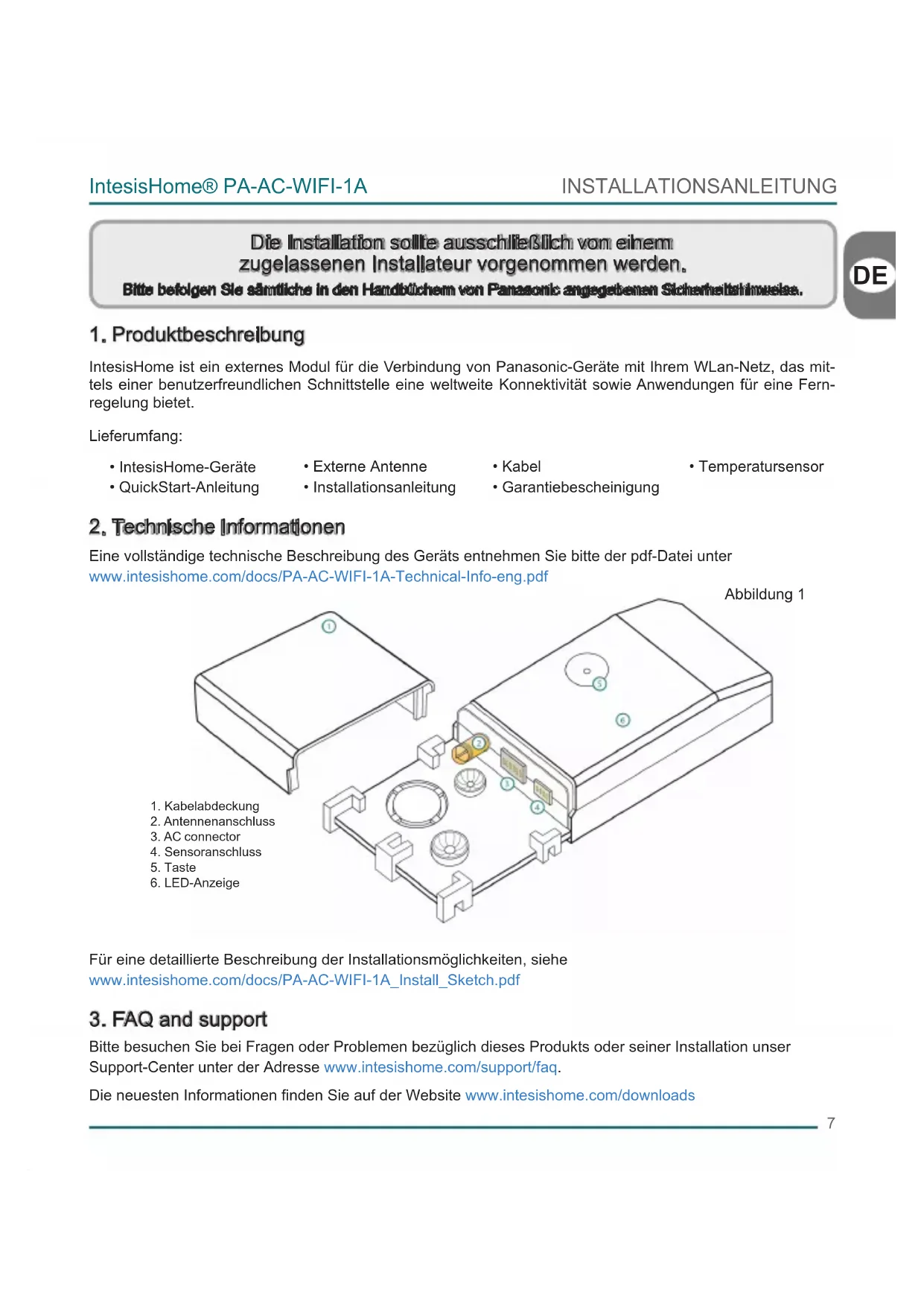 IntesisHome ist ein externes Modul für die Verbindung von Panasonic-Geräte mit Ihrem WLan-Netz, das mit- tels einer benutzerfreundlichen Schnittstelle eine weltweite Konnektivität sowie Anwendungen für eine Fern- regelung bietet. Lieferumfang: Eine vollständige technische Beschreibung des Geräts entnehmen Sie bitte der pdf-Datei unter www.intesishome.com/docs/PA-AC-WIFI-1A-Technical-Info-eng.pdf Für eine detaillierte Beschreibung der Installationsmöglichkeiten, siehe www.intesishome.com/docs/PA-AC-WIFI-1A_Install_Sketch.pdf Bitte besuchen Sie bei Fragen oder Problemen bezüglich dieses Produkts oder seiner Installation unser Support-Center unter der Adresse www.intesishome.com/support/faq. Die neuesten Informationen nden Sie auf der Website www.intesishome.com/downloads Die Installation sollte ausschließlich von einem zugelassenen Installateur vorgenommen werden. Bitte befolgen Sie sämtliche in den Handbüchern von Panasonic angegebenen Sicherheitshinweise.