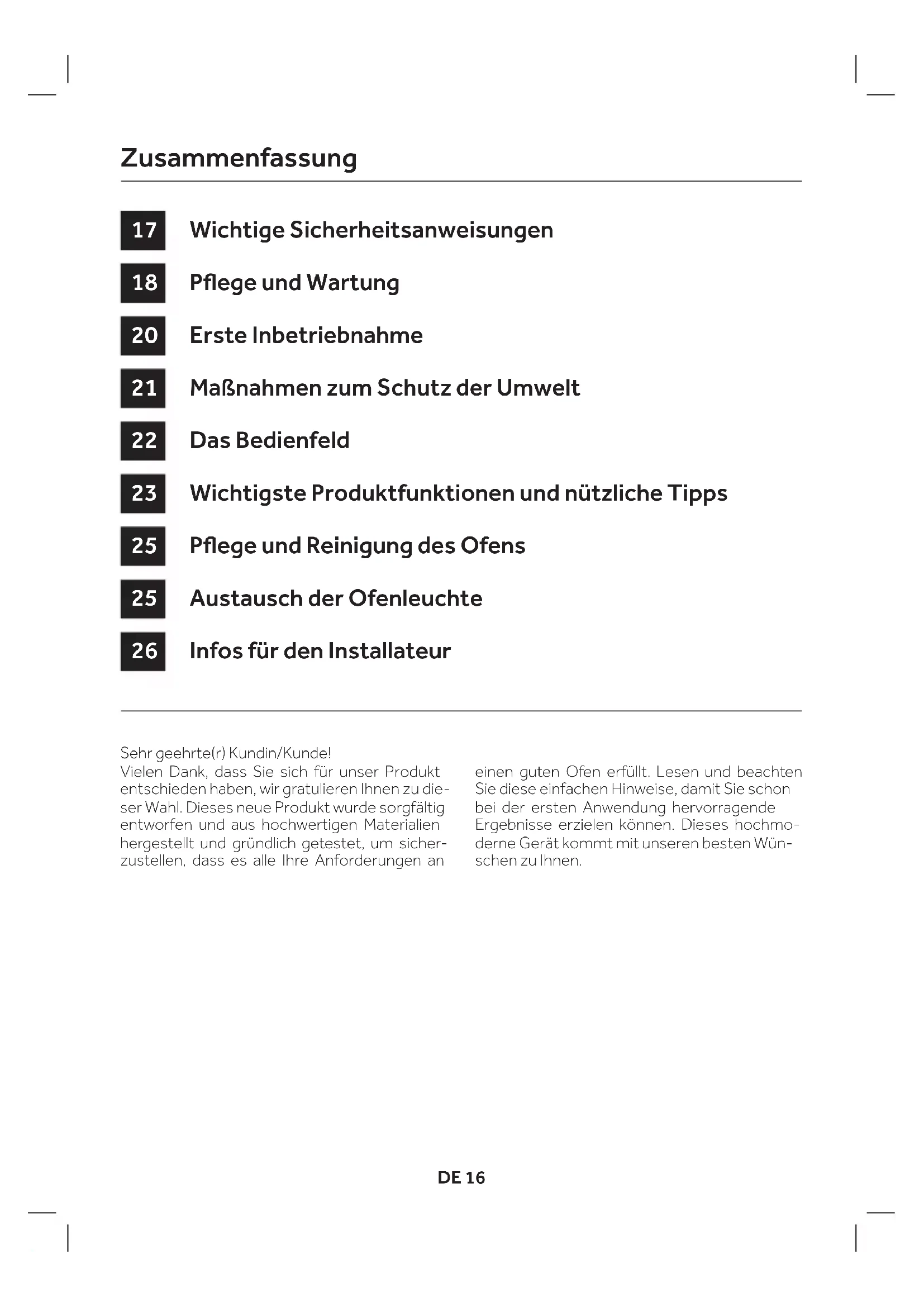 SASO H05RR-F 3x1,5 mm² H05RR-F 3x2,5 mm² H05VV-F 3x1,5 mm² H05VV-F 3x2,5 mm² H05RN-F 3x1,5 mm² H05RN-F 3x2,5 mm² H05V2V2-F 3x1,5 mm² H05V2V2-F 3x2,5 mm²DE 16 Sehr geehrte(r) Kundin/Kunde! Vielen Dank, dass Sie sich für unser Produkt entschieden haben, wir gratulieren Ihnen zu die- ser Wahl. Dieses neue Produkt wurde sorgfältig entworfen und aus hochwertigen Materialien hergestellt und gründlich getestet, um sicher- zustellen, dass es alle Ihre Anforderungen an einen guten Ofen erfüllt. Lesen und beachten Sie diese einfachen Hinweise, damit Sie schon bei der ersten Anwendung hervorragende Ergebnisse erzielen können. Dieses hochmo- derne Gerät kommt mit unseren besten Wün- schen zu Ihnen. Wichtige Sicherheitsanweisungen Pege und Wartung Erste Inbetriebnahme Maßnahmen zum Schutz der Umwelt Das Bedienfeld Wichtigste Produktfunktionen und nützliche Tipps Pege und Reinigung des Ofens Austausch der Ofenleuchte Infos für den Installateur