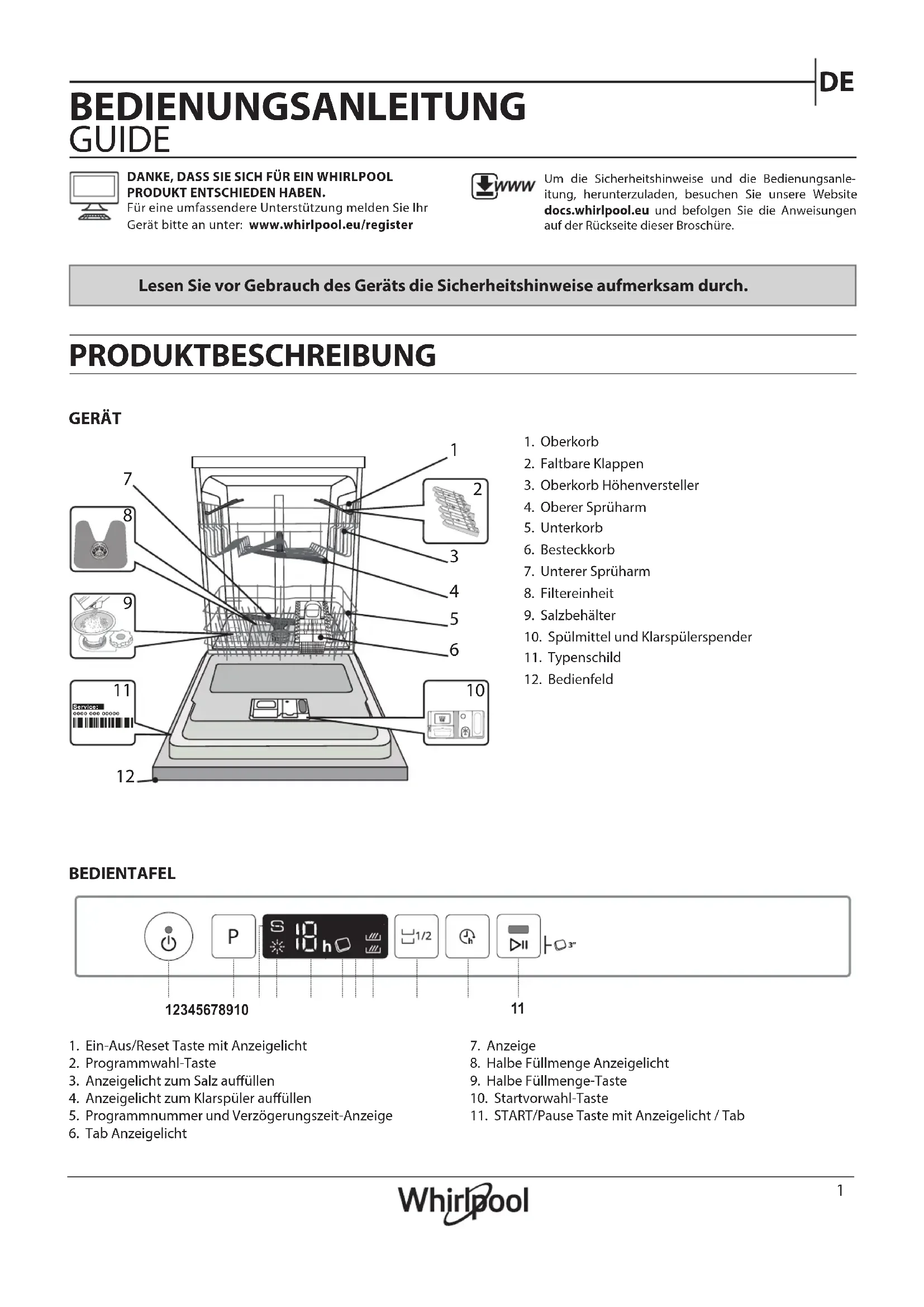 BEDIENUNGSANLEITUNG GUIDE Lesen Sie vor Gebrauch des Geräts die Sicherheitshinweise aufmerksam durch. PRODUKTBESCHREIBUNG GERÄT BEDIENTAFEL DANKE, DASS SIE SICH FÜR EIN WHIRLPOOL PRODUKT ENTSCHIEDEN HABEN. Für eine umfassendere Unterstützung melden Sie Ihr Gerät bitte an unter: www.whirlpool.eu/registerUm die Sicherheitshinweise und die Bedienungsanle-itung, herunterzuladen, besuchen Sie unsere Website docs.whirlpool.eu und befolgen Sie die Anweisungen auf der Rückseite dieser Broschüre.1. Oberkorb2. Faltbare Klappen3. Oberkorb Höhenversteller4. Oberer Sprüharm5. Unterkorb6. Besteckkorb7. Unterer Sprüharm8. Filtereinheit9. Salzbehälter10. Spülmittel und Klarspülerspender11. Typenschild12. Bedienfeld1. Ein-Aus/Reset Taste mit Anzeigelicht2. Programmwahl-Taste3. Anzeigelicht zum Salz auüllen4. Anzeigelicht zum Klarspüler auüllen5. Programmnummer und Verzögerungszeit-Anzeige6. Tab Anzeigelicht7. Anzeige8. Halbe Füllmenge Anzeigelicht9. Halbe Füllmenge-Taste 10. Startvorwahl-Taste11. START/Pause Taste mit Anzeigelicht / Tab1 2 3 4 5 6 7 8 9 10 0000 000 00000 Service: