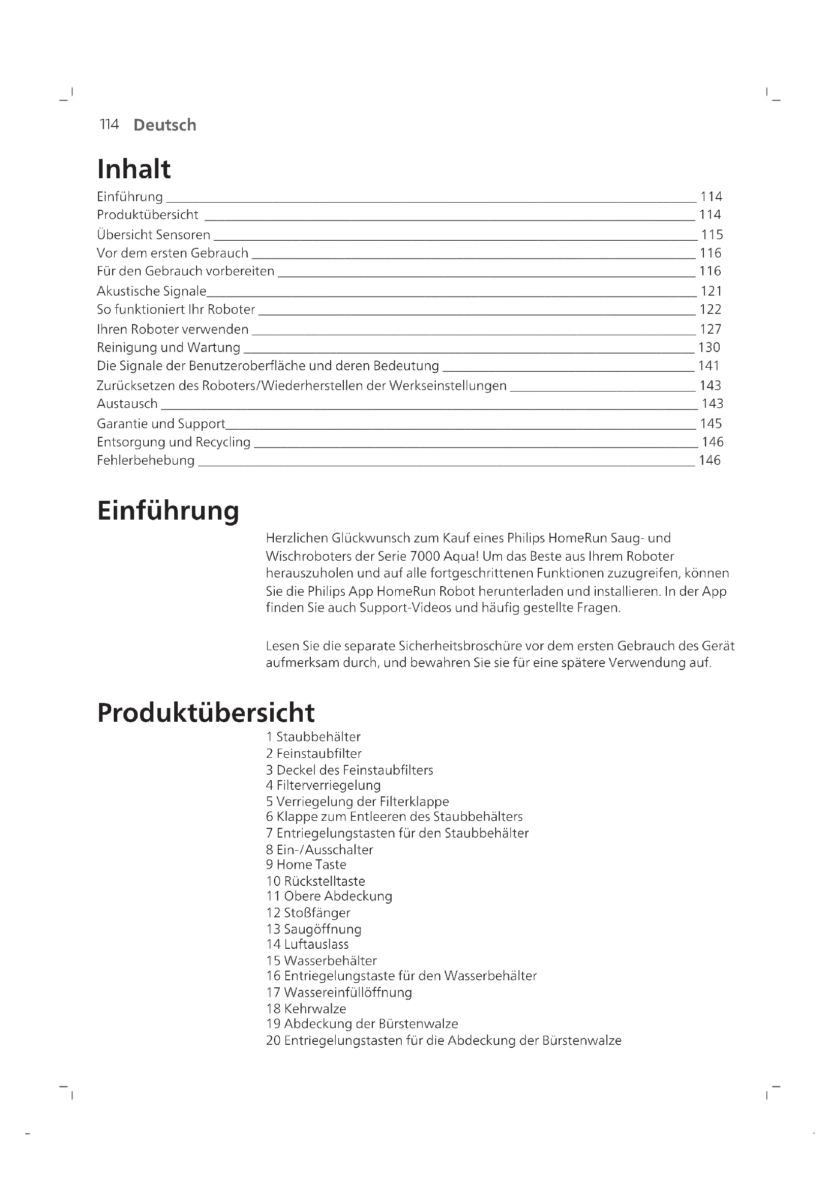 Deutsch Inhalt Einführung ________________________________________________________________________________ 114 Produktübersicht __________________________________________________________________________ 114 Übersicht Sensoren _________________________________________________________________________ 115 Vor dem ersten Gebrauch ___________________________________________________________________ 116 Für den Gebrauch vorbereiten _______________________________________________________________ 116 Akustische Signale__________________________________________________________________________ 121 So funktioniert Ihr Roboter __________________________________________________________________ 122 Ihren Roboter verwenden ___________________________________________________________________ 127 Reinigung und Wartung ____________________________________________________________________ 130 Die Signale der Benutzeroberfläche und deren Bedeutung ______________________________________ 141 Zurücksetzen des Roboters/Wiederherstellen der Werkseinstellungen ____________________________ 143 Austausch _________________________________________________________________________________ 143 Garantie und Support_______________________________________________________________________ 145 Entsorgung und Recycling ___________________________________________________________________ 146 Fehlerbehebung ___________________________________________________________________________ 146 Einführung Herzlichen Glückwunsch zum Kauf eines Philips HomeRun Saug- und Wischroboters der Serie 7000 Aqua! Um das Beste aus Ihrem Roboter herauszuholen und auf alle fortgeschrittenen Funktionen zuzugreifen, können Sie die Philips App HomeRun Robot herunterladen und installieren. In der App finden Sie auch Support-Videos und häufig gestellte Fragen. Lesen Sie die separate Sicherheitsbroschüre vor dem ersten Gebrauch des Gerät aufmerksam durch, und bewahren Sie sie für eine spätere Verwendung auf. Produktübersicht 1 Staubbehälter 2 Feinstaubfilter 3 Deckel des Feinstaubfilters 4 Filterverriegelung 5 Verriegelung der Filterklappe 6 Klappe zum Entleeren des Staubbehälters 7 Entriegelungstasten für den Staubbehälter 8 Ein-/Ausschalter 9 Home Taste 10 Rückstelltaste 11 Obere Abdeckung 12 Stoßfänger 13 Saugöffnung 14 Luftauslass 15 Wasserbehälter 16 Entriegelungstaste für den Wasserbehälter 17 Wassereinfüllöffnung 18 Kehrwalze 19 Abdeckung der Bürstenwalze 20 Entriegelungstasten für die Abdeckung der Bürstenwalze115 Deutsch 21 Räder 22 Vorderrad 23 Ladekontakte (Roboter) 24 Seitenbürste 25 Wischplatte 26 Wischtuch (2x) 27 Netzkabel (XU7000) 28 (Lade)station (XU7000) 29 Infrarot-Signalsender (XU7000) 30 Ladekontakte (Station) 31 Steckdose für Netzkabel 32 Unterlage (XU7000) 33 Staubbeutel (2x) (XU7100) 34 Behälterdeckel 35 Staubbeutelfach 36 Absaugstation (XU7100) 37 LED-Anzeige 38 Infrarot-Signalsender 39 Auffahrrampe 40 Ansaugöffnung 41 Absaug-Luftauslass 42 Ladekontakte (Station) 43 Abluftöffnung 44 Bürsten-Reinigungswerkzeug 45 Steckdose für Netzkabel 46 Netzkabel (XU7100) Übersicht Sensoren