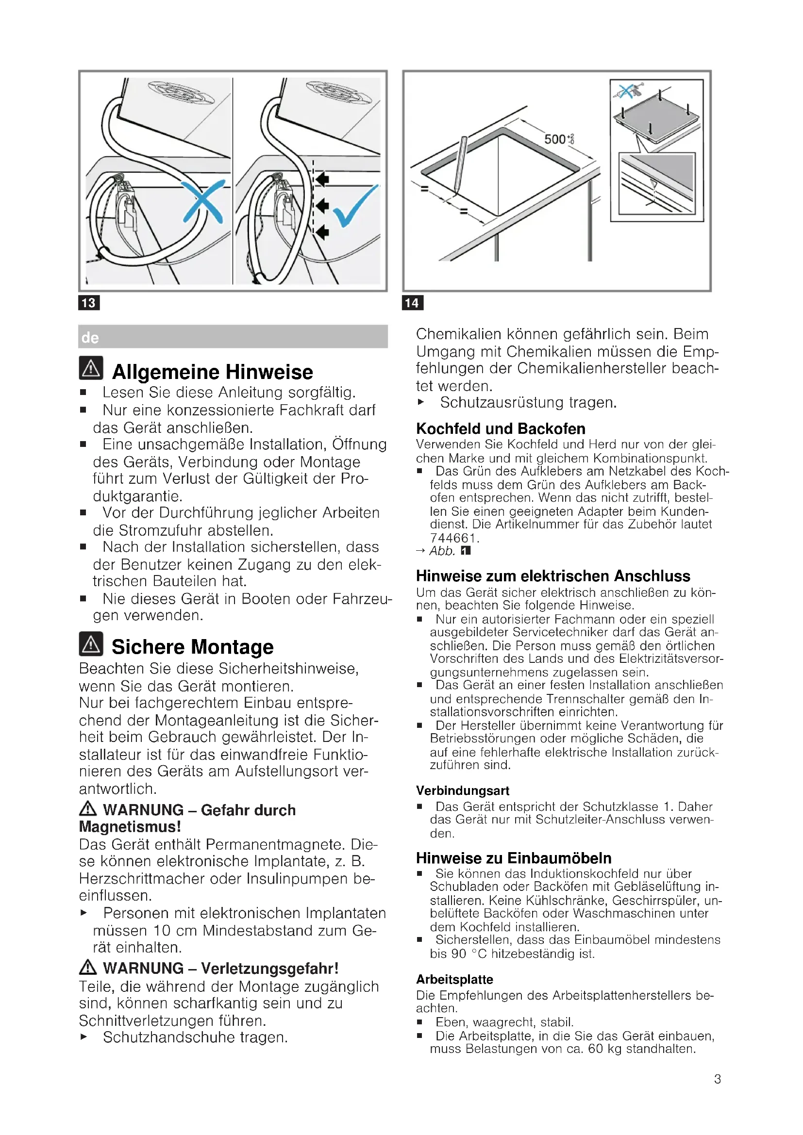 Allgemeine Hinweise ¡ Lesen Sie diese Anleitung sorgfältig. ¡ Nur eine konzessionierte Fachkraft darf das Gerät anschließen. ¡ Eine unsachgemäße Installation, Öffnung des Geräts, Verbindung oder Montage führt zum Verlust der Gültigkeit der Pro- duktgarantie. ¡ Vor der Durchführung jeglicher Arbeiten die Stromzufuhr abstellen. ¡ Nach der Installation sicherstellen, dass der Benutzer keinen Zugang zu den elek- trischen Bauteilen hat. ¡ Nie dieses Gerät in Booten oder Fahrzeu- gen verwenden. Sichere Montage Beachten Sie diese Sicherheitshinweise, wenn Sie das Gerät montieren. Nur bei fachgerechtem Einbau entspre- chend der Montageanleitung ist die Sicher- heit beim Gebrauch gewährleistet. Der In- stallateur ist für das einwandfreie Funktio- nieren des Geräts am Aufstellungsort ver- antwortlich. WARNUNG‒Gefahr durch Magnetismus! Das Gerät enthält Permanentmagnete. Die- se können elektronische Implantate, z.B. Herzschrittmacher oder Insulinpumpen be- einflussen. ▶ Personen mit elektronischen Implantaten müssen 10cm Mindestabstand zum Ge- rät einhalten. WARNUNG‒Verletzungsgefahr! Teile, die während der Montage zugänglich sind, können scharfkantig sein und zu Schnittverletzungen führen. ▶ Schutzhandschuhe tragen. Chemikalien können gefährlich sein. Beim Umgang mit Chemikalien müssen die Emp- fehlungen der Chemikalienhersteller beach- tet werden. ▶ Schutzausrüstung tragen. Kochfeld und Backofen Verwenden Sie Kochfeld und Herd nur von der glei- chen Marke und mit gleichem Kombinationspunkt. ¡ Das Grün des Aufklebers am Netzkabel des Koch- felds muss dem Grün des Aufklebers am Back- ofen entsprechen. Wenn das nicht zutrifft, bestel- len Sie einen geeigneten Adapter beim Kunden- dienst. Die Artikelnummer für das Zubehör lautet